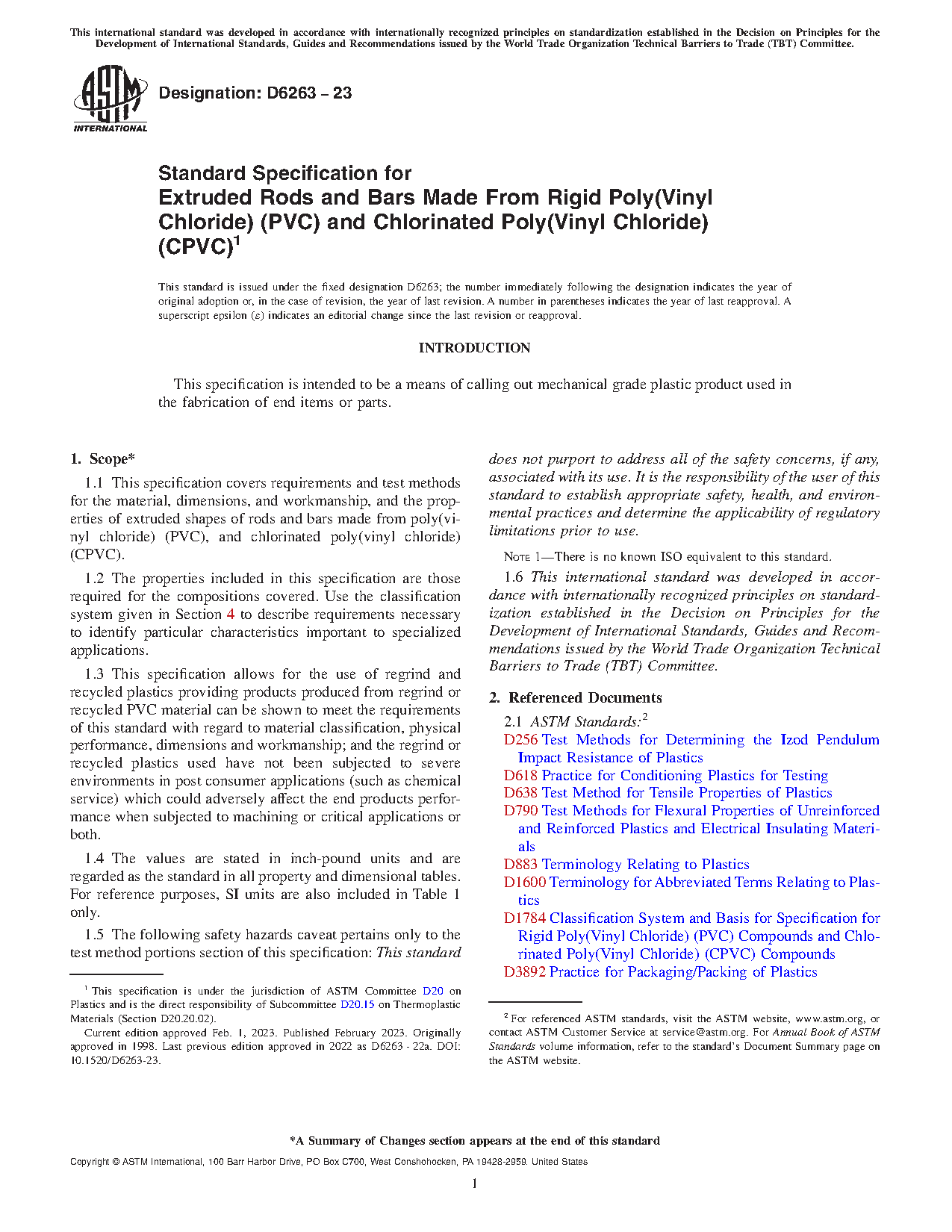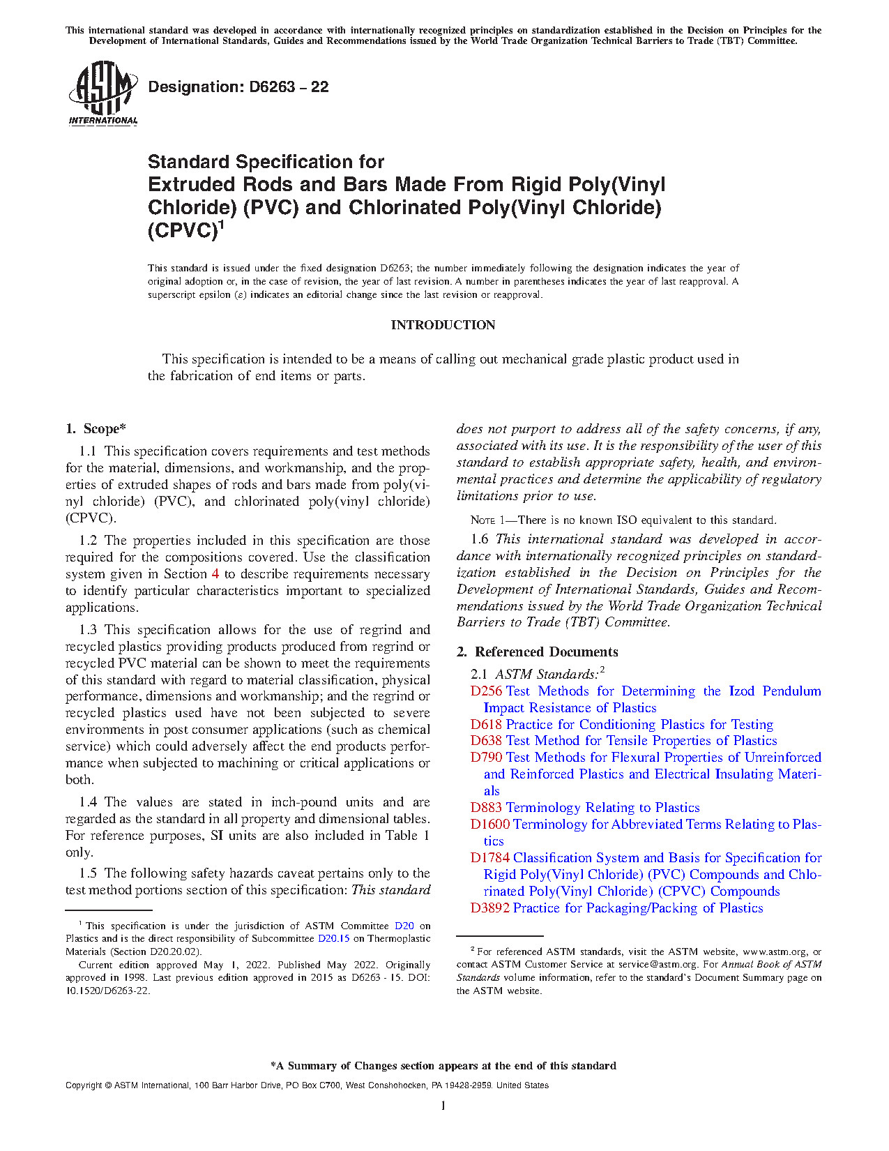 1.5 The following safety hazards caveat pertains only to the test method portions section of this specification: This standard does not purport to address all of the safety concerns, if any, associated with its use. It is the responsibility of the user of this standard to establish appropriate safety and health practices and determine the applicability of regulatory limitations prior to use. This specification covers requirements and test methods for the material, dimensions, and workmanship, and the properties of extruded shapes of rods and bars made from poly(vinyl chloride) (PVC), and chlorinated poly(vinyl chloride) (CPVC). The type of poly(vinyl chloride), and chlorinated poly(vinyl chloride) shape product may be categorized by type, grade, and class depending on resin composition: Types 01 and 02; Classes 0 and 1; Grades 0 and 1. The type, class and grade is further differentiated based on dimensional stability. The following test methods shall be performed: tensile stress at break; elongation at break; tensile modulus; dimensional stability; lengthwise chamber; flexural modulus; izod impact; and degree of fusion of extruded PVC and CPVC by solvent immersion.