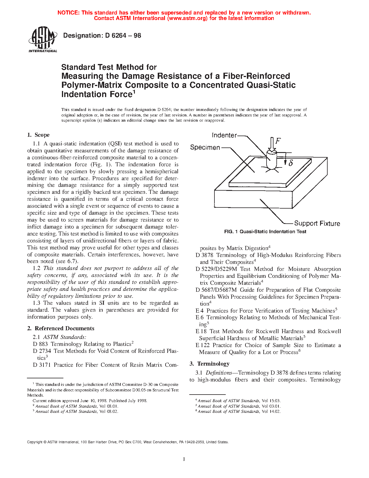 1.1 A quasi-static indentation (QSI) test method is used to obtain quantitative measurements of the damage resistance of a continuous-fiber-reinforced composite material to a concentrated indentation force (Fig 1). The indentation force is applied to the specimen by slowly pressing a hemispherical indenter into the surface. Procedures are specified for determining the damage resistance for a simply supported test specimen and for a rigidly backed test specimen. The damage resistance is quantified in terms of a critical contact force associated with a single event or sequence of events to cause a specific size and type of damage in the specimen. These tests may be used to screen materials for damage resistance or to inflict damage into a specimen for subsequent damage tolerance testing. This test method is limited to use with composites consisting of layers of unidirectional fibers or layers of fabric. This test method may prove useful for other types and classes of composite materials. Certain interferences, however, have been noted (see 6.7).