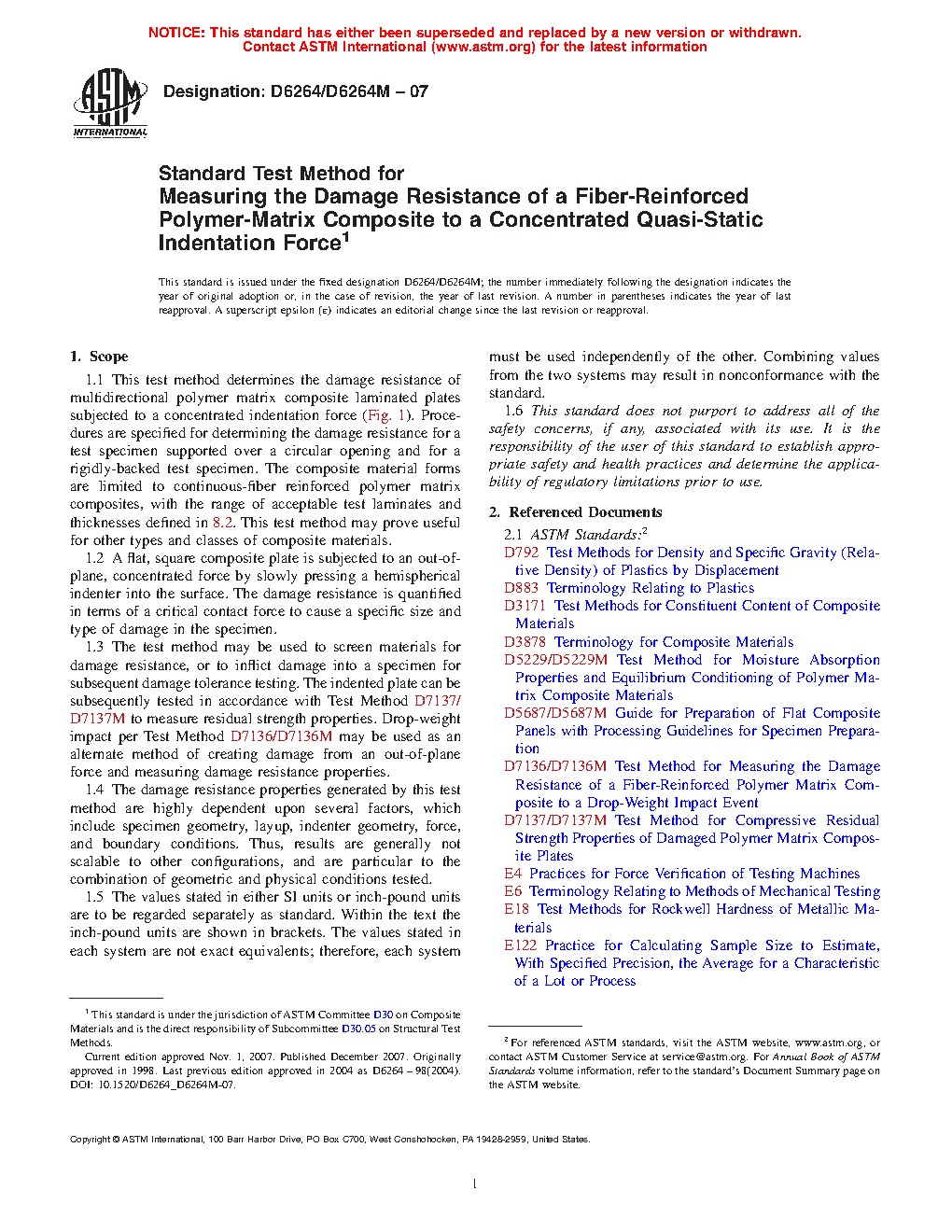 1.1 This test method determines the damage resistance of multidirectional polymer matrix composite laminated plates subjected to a concentrated indentation force (Fig. 1). Procedures are specified for determining the damage resistance for a test specimen supported over a circular opening and for a rigidly-backed test specimen. The composite material forms are limited to continuous-fiber reinforced polymer matrix composites, with the range of acceptable test laminates and thicknesses defined in 8.2. This test method may prove useful for other types and classes of composite materials.