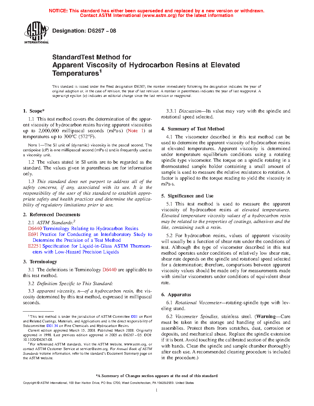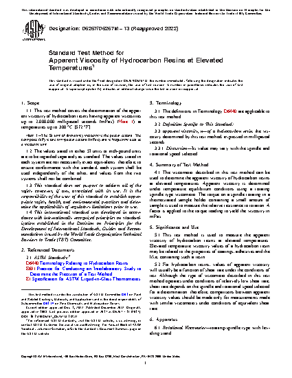 1.1 This test method covers the determination of the apparent viscosity of hydrocarbon resins having apparent viscosities up to 2,000,000 millipascal seconds (mPa·s) (Note 1) at temperatures up to 300°C [572°F].