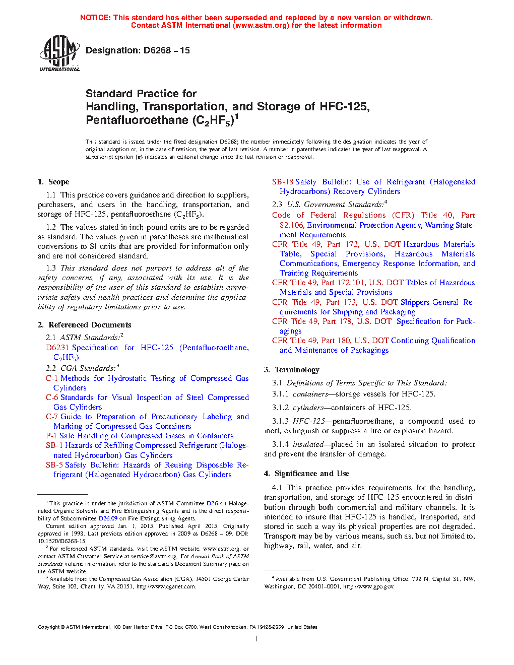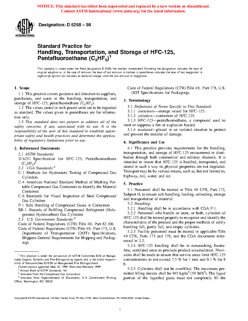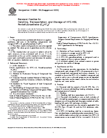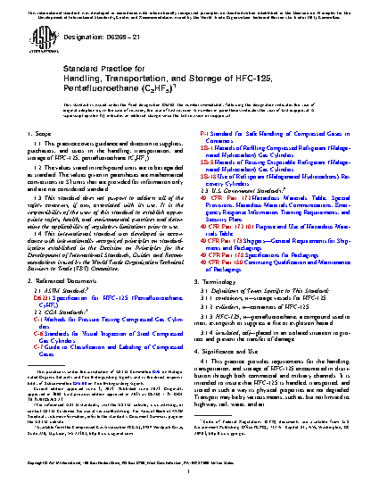 1.1 This practice covers guidance and direction to suppliers, purchasers, and users in the handling, transportation, and storage of HFC-125, pentafluoroethane (C2HF5).