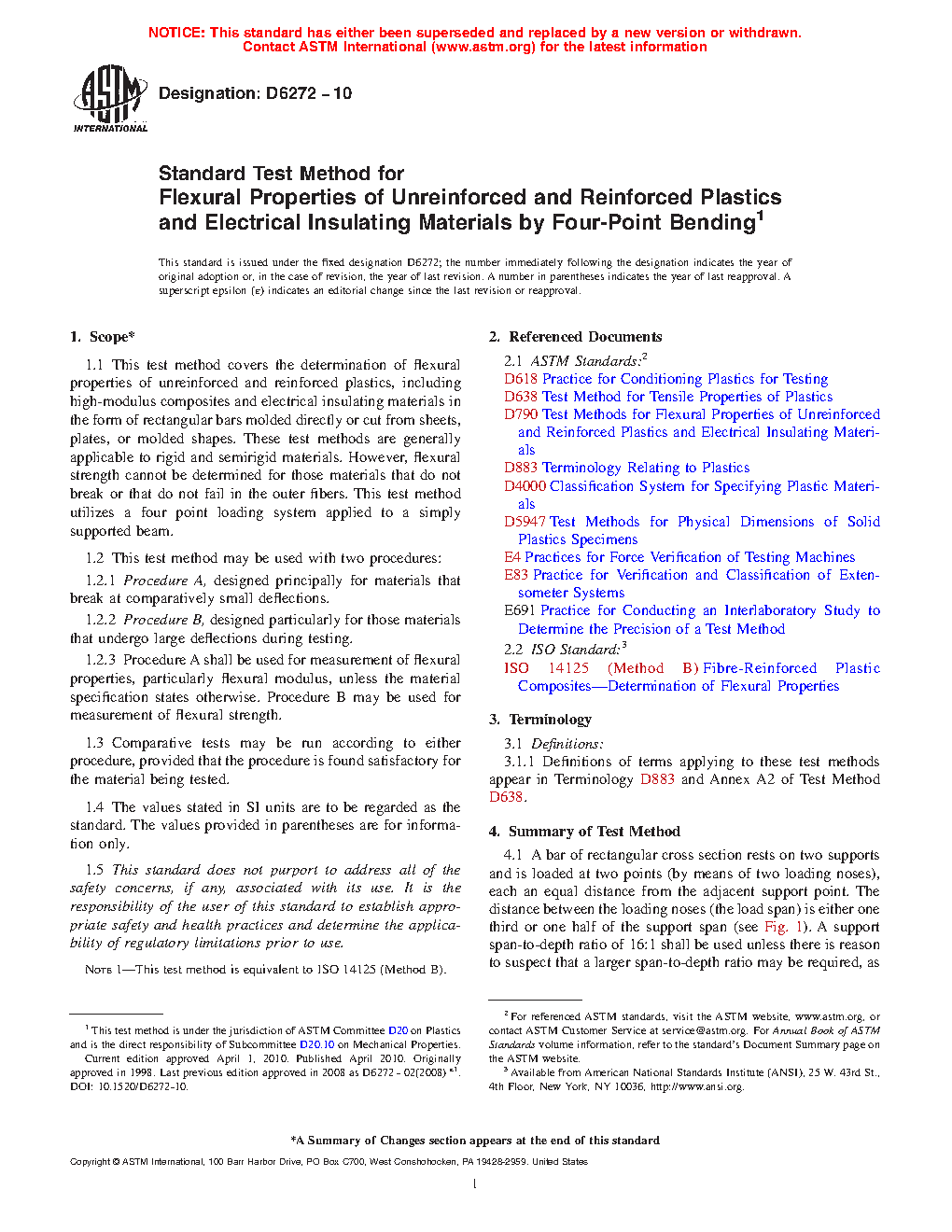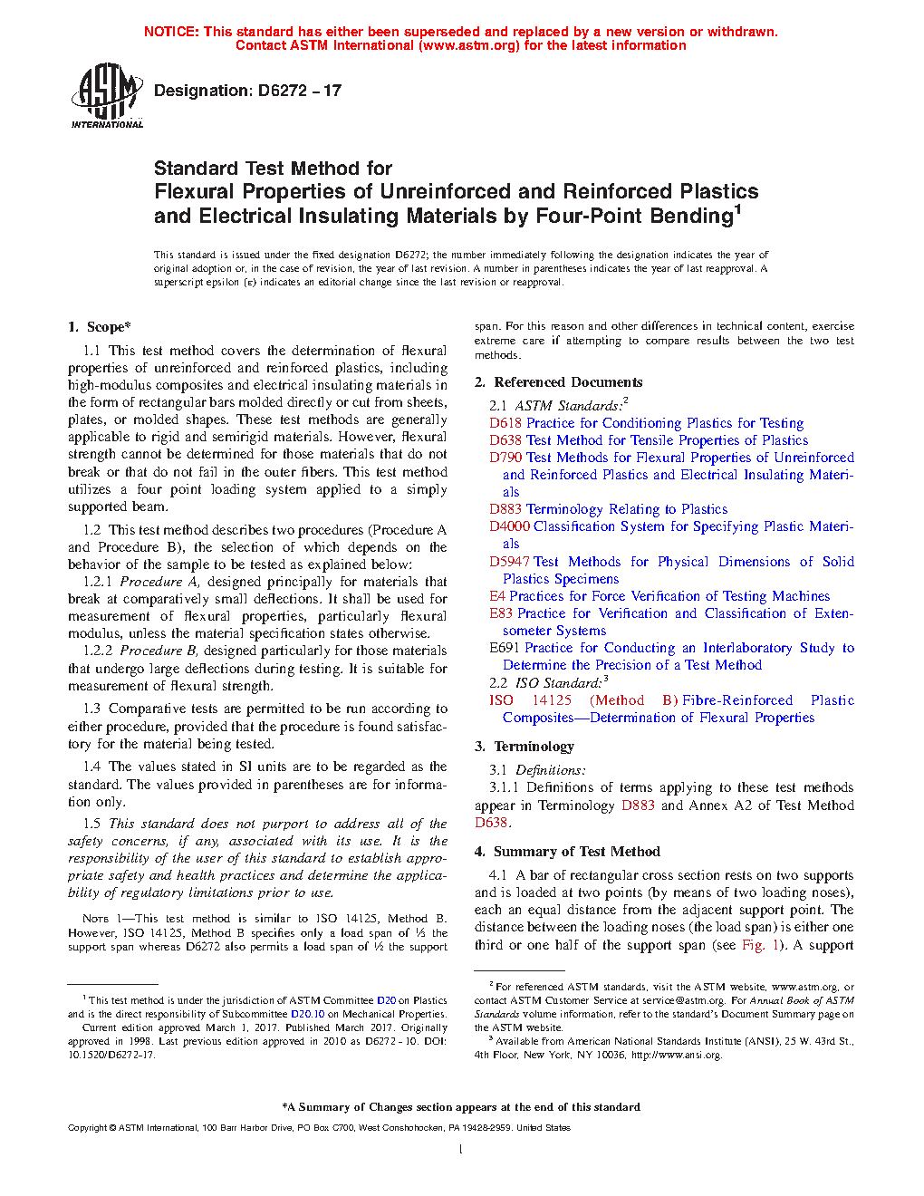 1.1 This test method covers the determination of flexural properties of unreinforced and reinforced plastics, including high-modulus composites and electrical insulating materials in the form of rectangular bars molded directly or cut from sheets, plates, or molded shapes. These test methods are generally applicable to rigid and semirigid materials. However, flexural strength cannot be determined for those materials that do not break or that do not fail in the outer fibers. This test method utilizes a four point loading system applied to a simply supported beam.