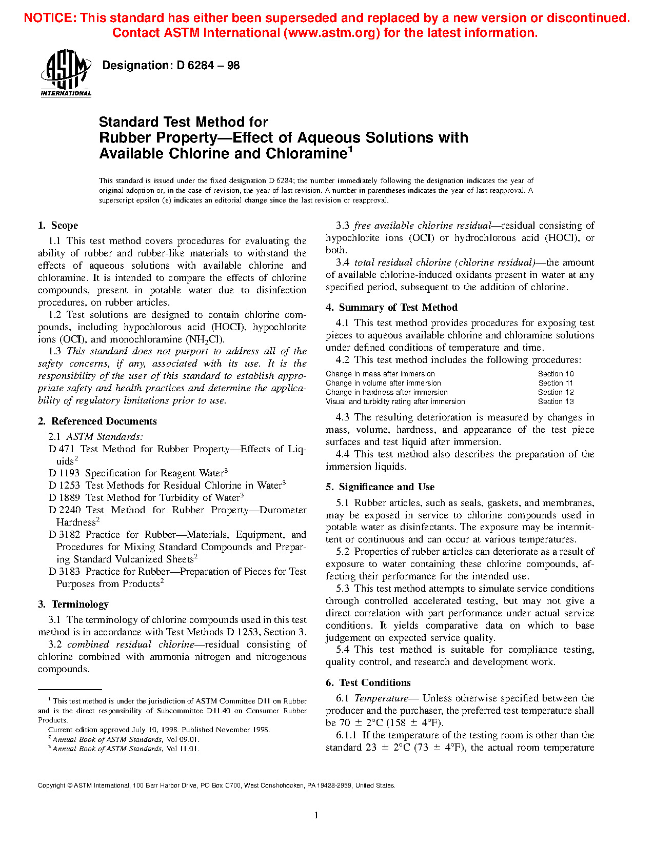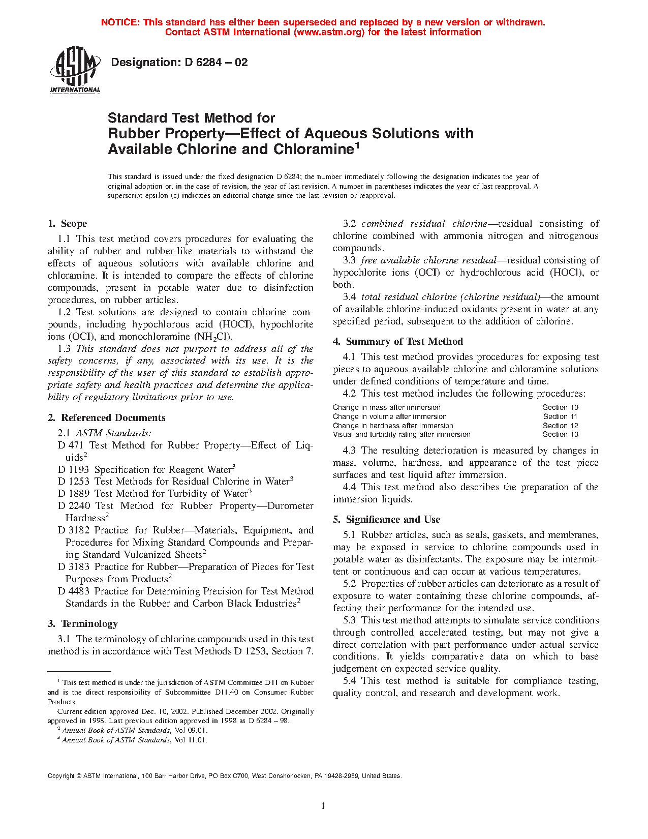 1.1 This test method covers procedures for evaluating the ability of rubber and rubber-like materials to withstand the effects of aqueous solutions with available chlorine and chloramine. It is intended to compare the effects of chlorine compounds, present in potable water due to disinfection procedures, on rubber articles.