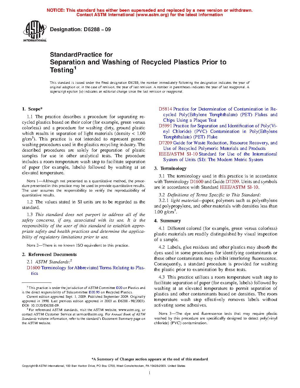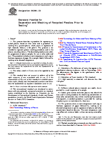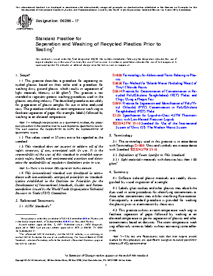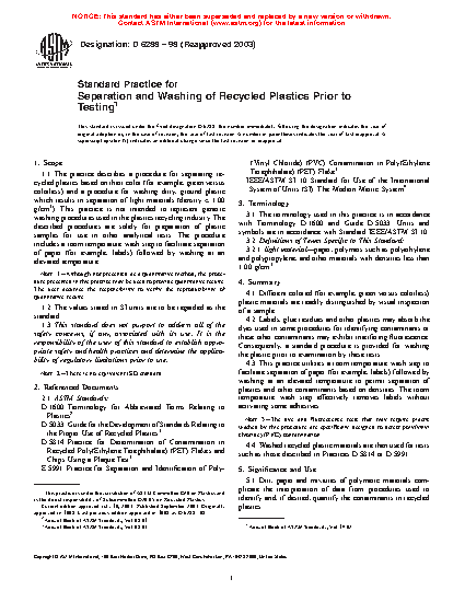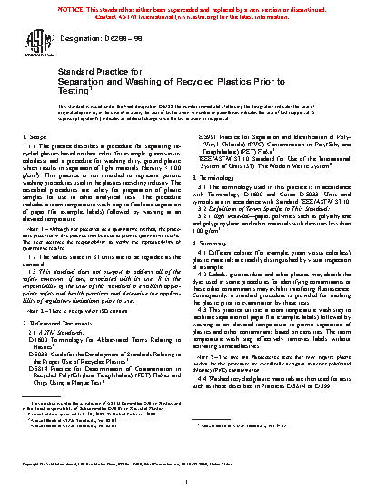 1.1 The practice describes a procedure for separating recycled plastics based on their color (for example, green versus colorless) and a procedure for washing dirty, ground plastic which results in separation of light materials (density < 1.00 g/cm3). This practice is not intended to represent generic washing procedures used in the plastics recycling industry. The described procedures are solely for preparation of plastic samples for use in other analytical tests. The procedure includes a room temperature wash step to facilitate separation of paper (for example, labels) followed by washing at an elevated temperature.