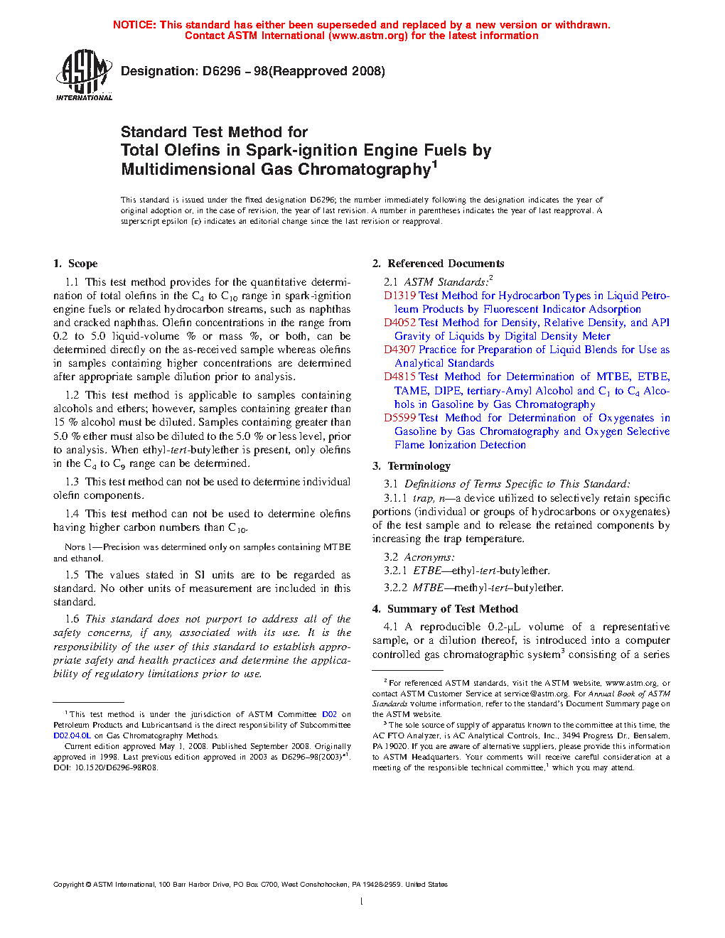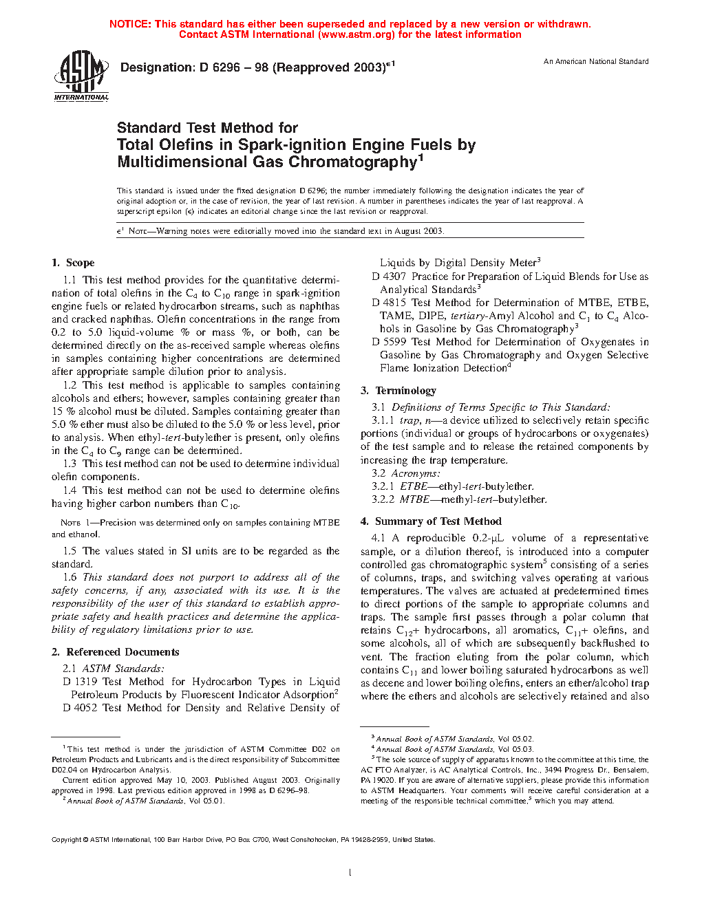1.1 This test method provides for the quantitative determination of total olefins in the C4 to C10 range in spark-ignition engine fuels or related hydrocarbon streams, such as naphthas and cracked naphthas. Olefin concentrations in the range from 0.2 % by liquid-volume or mass to 5.0 % by liquid-volume or mass, or both, can be determined directly on the as-received sample whereas olefins in samples containing higher concentrations are determined after appropriate sample dilution prior to analysis.