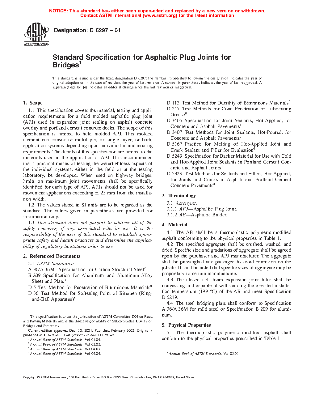 This specification covers the standards the material, testing and application requirements for a field molded asphaltic plug joint (APJ) used in expansion joint sealing on asphalt concrete overlay and portland cement concrete decks. This specification is limited only to field molded APJ which can consist of multilayer, or single layer, or both, application systems. The asphaltic binder to be used shall be a thermoplastic polymeric-modified asphalt. The aggregates shall be crushed, washed, and dried. Physical properties of the asphalt such as softening point, tensile adhesion, ductility, resilience, and flexibility shall also be tested and shall conform to other ASTM documents prescribed herein.