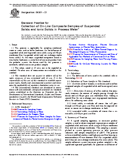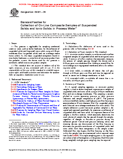 1.1 This practice is applicable for sampling condensed steam or water, such as boiler feedwater, for the collection of suspended solids and (optional) ionic solids using a 0.45-μm membrane filter (suspended solids) and ion exchange media (ionic solids). As the major suspended component found in most boiler feedwaters is some form of corrosion product from the preboiler system, the device used for this practice is commonly called a corrosion product sampler.