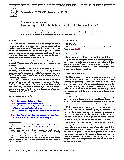 1.1 This practice is intended to evaluate changes in kinetic performance of ion exchange resins used in mixed beds to produce high purity water. Within strict limitations, it also may be used for comparing resin of different types. This standard does not seek to mimic actual operating conditions. Specific challenge solutions and conditions are specified. At the option of the user, other conditions may be tested.