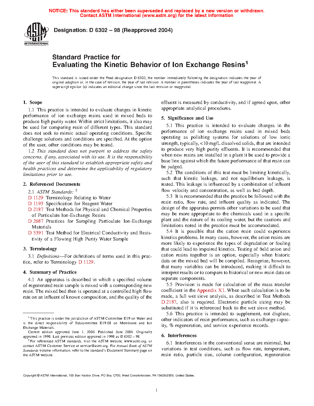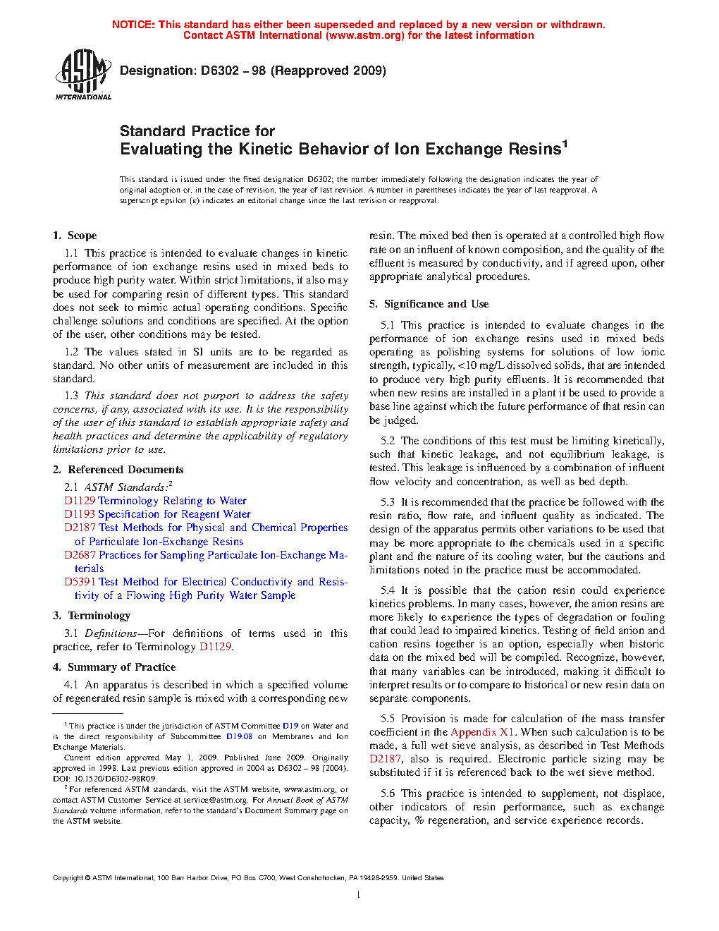 5.6 This practice is intended to supplement, not displace, other indicators of resin performance, such as exchange capacity, percent regeneration, and service experience records.