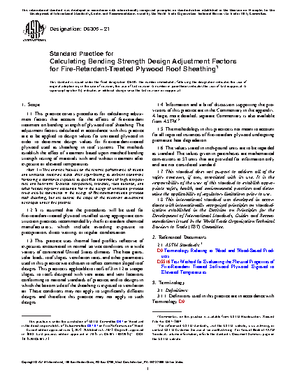 1.1 This practice covers procedures for calculating adjustment factors that account for the effects of fire-retardant treatment on bending strength of plywood roof sheathing. The adjustment factors calculated in accordance with this practice are to be applied to design values for untreated plywood in order to determine design values for fire-retardant-treated plywood used as sheathing in roof systems. The methods establish the effect of treatment based upon matched bending strength testing of materials with and without treatment after exposure at elevated temperatures.