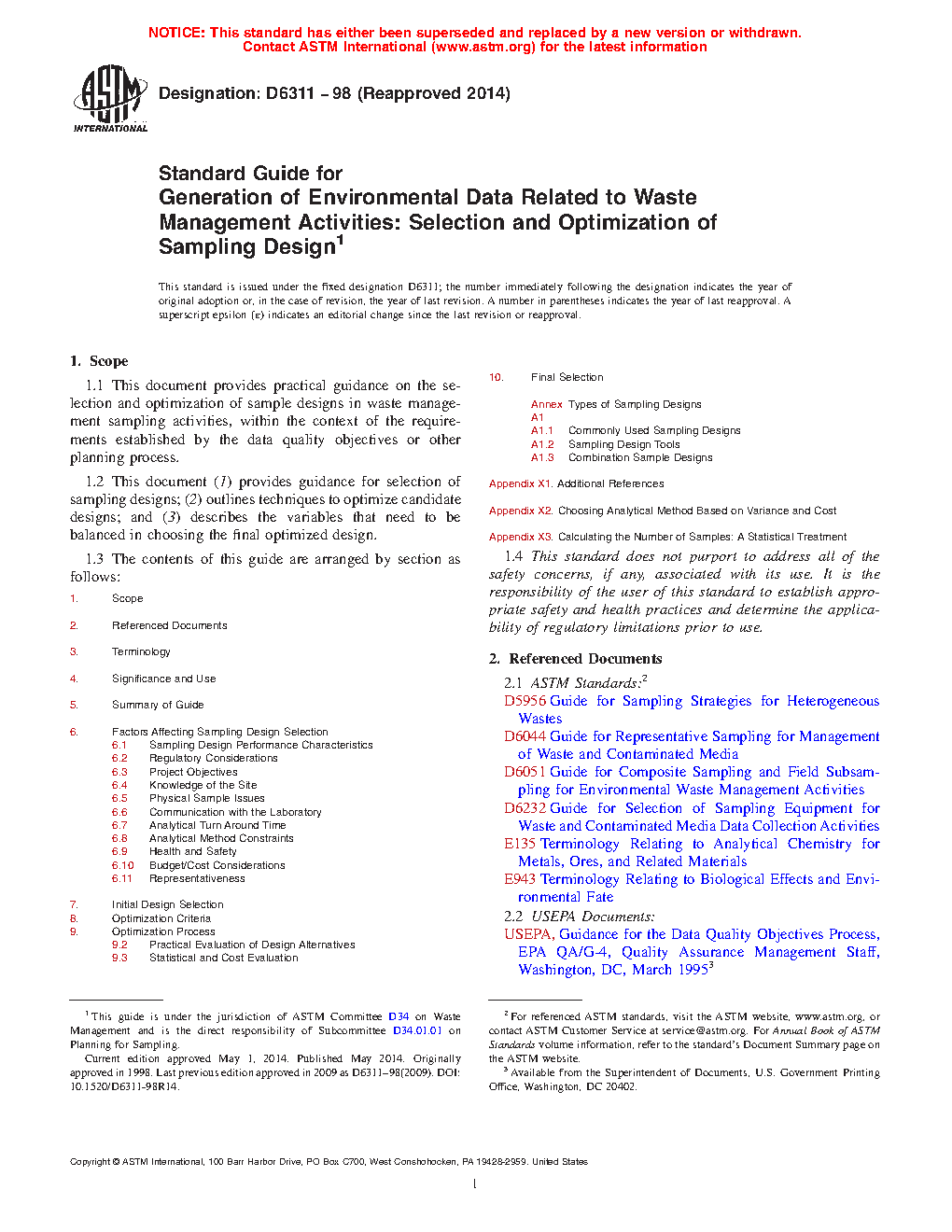 The intended use of this guide is to provide practical assistance in the development of an optimized sampling design. This standard describes or discusses: