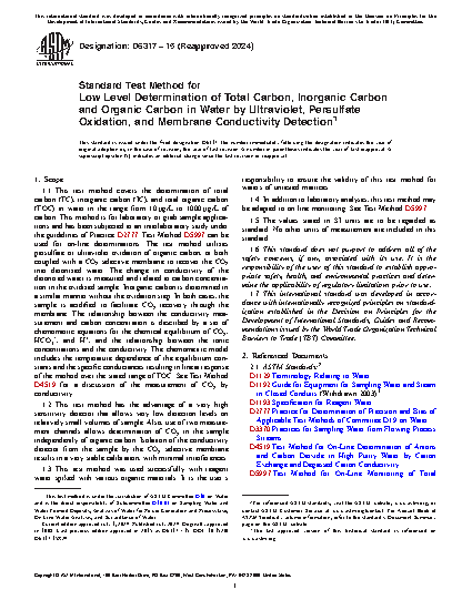 1.1 This test method covers the determination of total carbon (TC), inorganic carbon (IC), and total organic carbon (TOC) in water in the range from 10 to 1000 μg/L of carbon. This method is for laboratory or grab sample applications and has been subjected to an interlaboratory study under the guidelines of D2777. Test Method D5997 can be used for on-line determinations. The test method utilizes persulfate or ultraviolet oxidation of organic carbon, or both coupled with a CO2 selective membrane to recover the CO2 into deionized water. The change in conductivity of the deionized water is measured and related to carbon concentration in the oxidized sample. Inorganic carbon is determined in a similar manner without the oxidation step. In both cases, the sample is acidified to facilitate CO2 recovery through the membrane. The relationship between the conductivity measurement and carbon concentration is described by a set of chemometric equations for the chemical equilibrium of CO2, HCO3– , and H+, and the relationship between the ionic concentrations and the conductivity. The chemometric model includes the temperature dependence of the equilibrium constants and the specific conductances resulting in linear response of the method over the stated range of TOC. See Test Method D4519 for a discussion of the measurement of CO2 by conductivity.