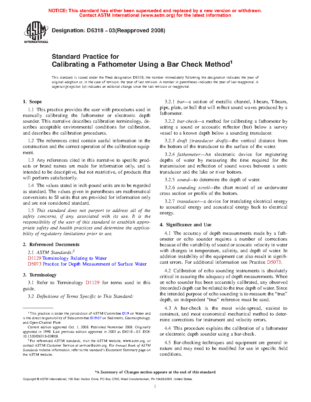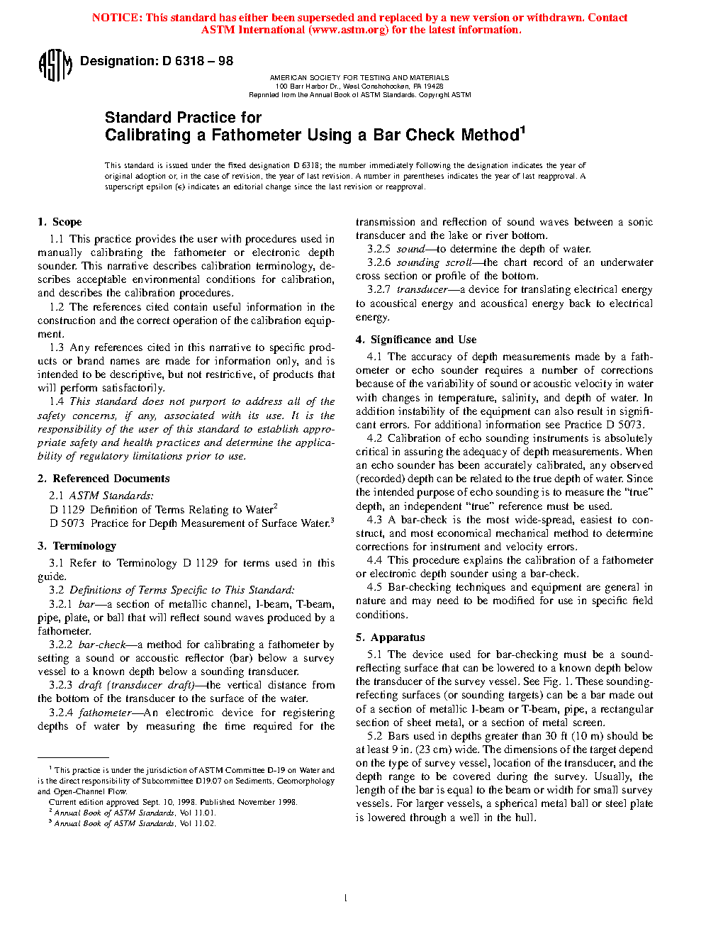 The accuracy of depth measurements made by a fathometer or echo sounder requires a number of corrections because of the variability of sound or acoustic velocity in water with changes in temperature, salinity, and depth of water. In addition instability of the equipment can also result in significant errors. For additional information see Practice D 5073.