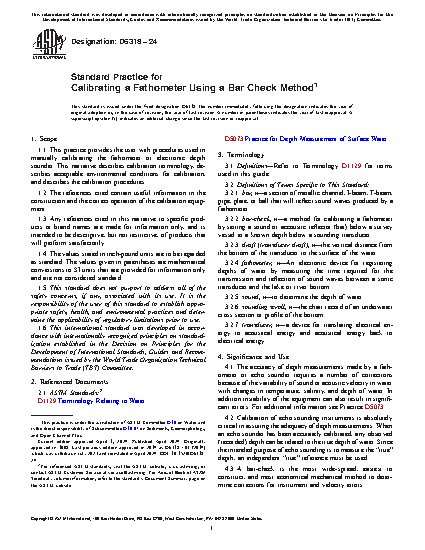 1.1 This practice provides the user with procedures used in manually calibrating the fathometer or electronic depth sounder. This narrative describes calibration terminology, describes acceptable environmental conditions for calibration, and describes the calibration procedures.