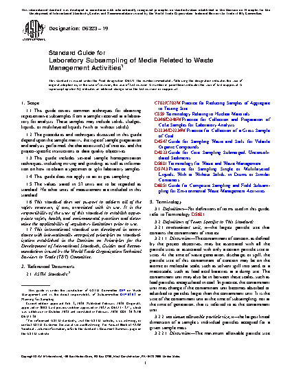 1.1 This guide covers common techniques for obtaining representative subsamples from a sample received at a laboratory for analysis. These samples may include solids, sludges, liquids, or multilayered liquids (with or without solids).