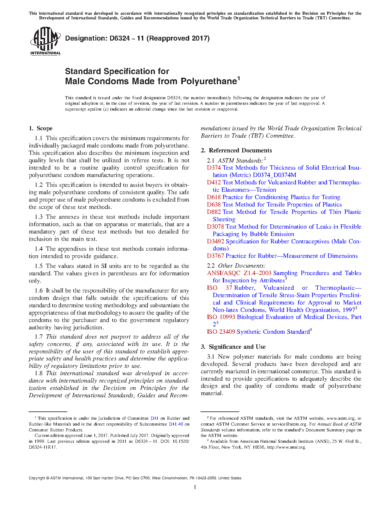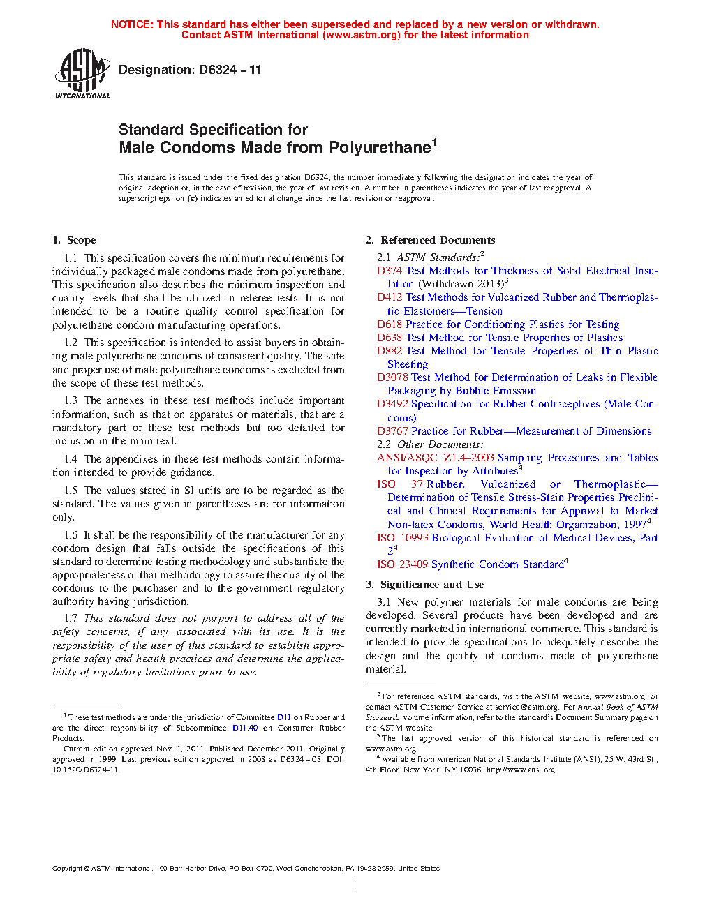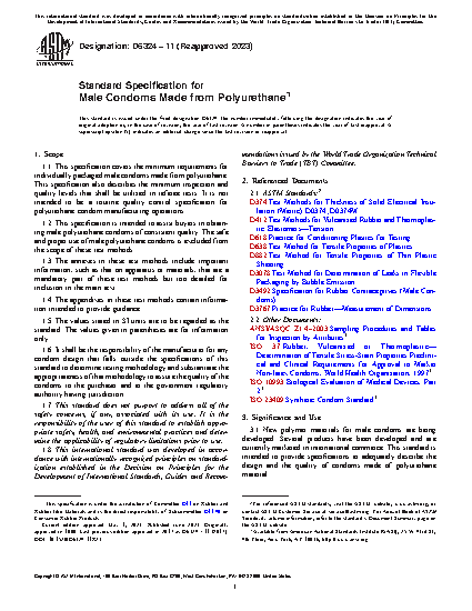 1.1 This specification covers the minimum requirements for individually packaged male condoms made from polyurethane. This specification also describes the minimum inspection and quality levels that shall be utilized in referee tests. It is not intended to be a routine quality control specification for polyurethane condom manufacturing operations.