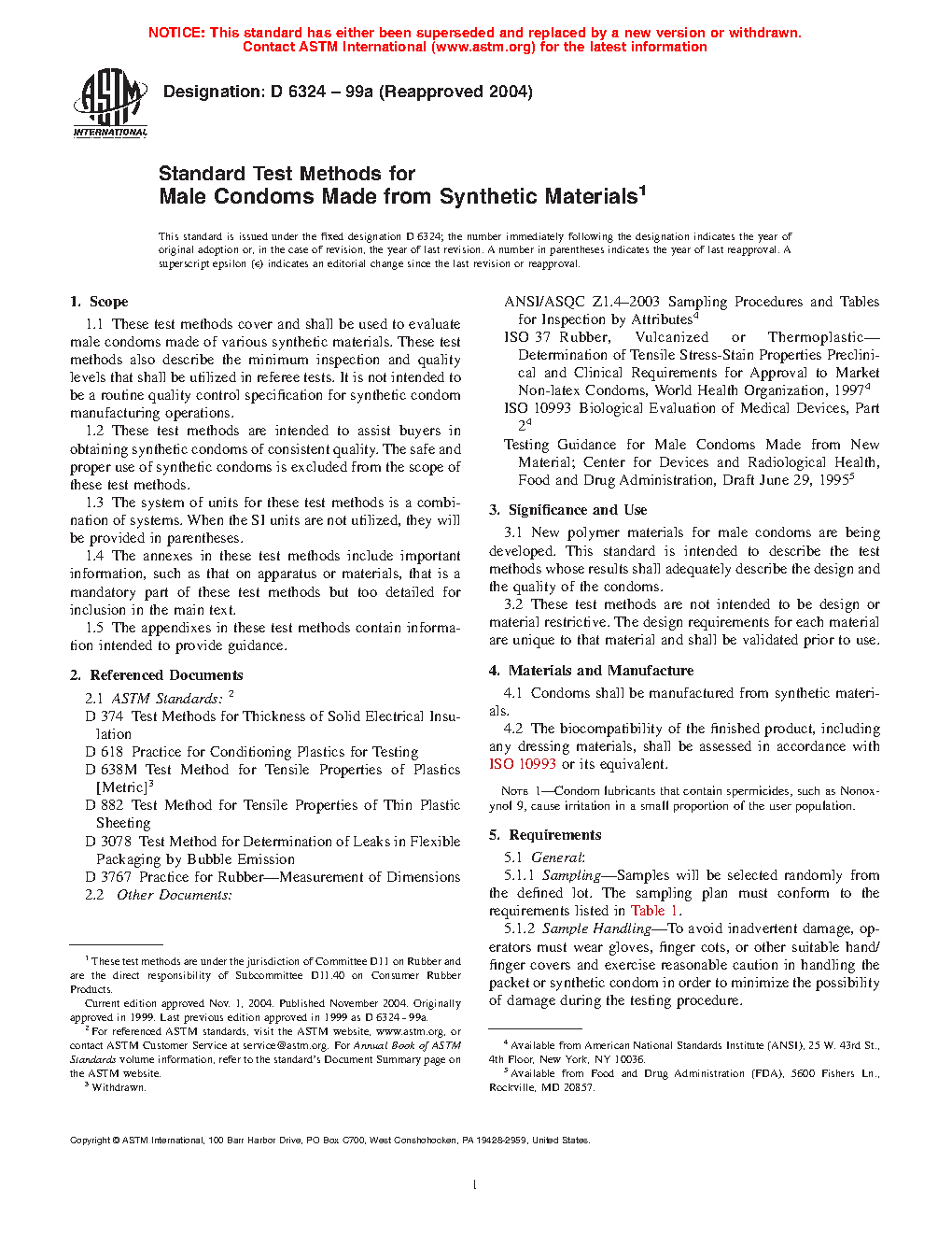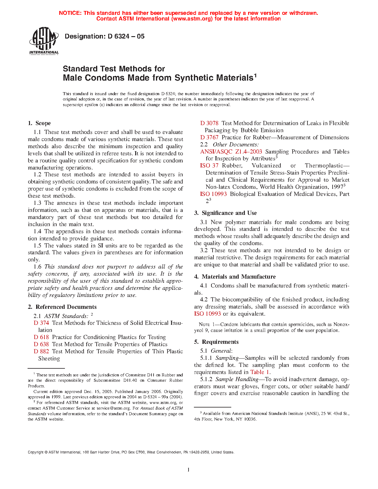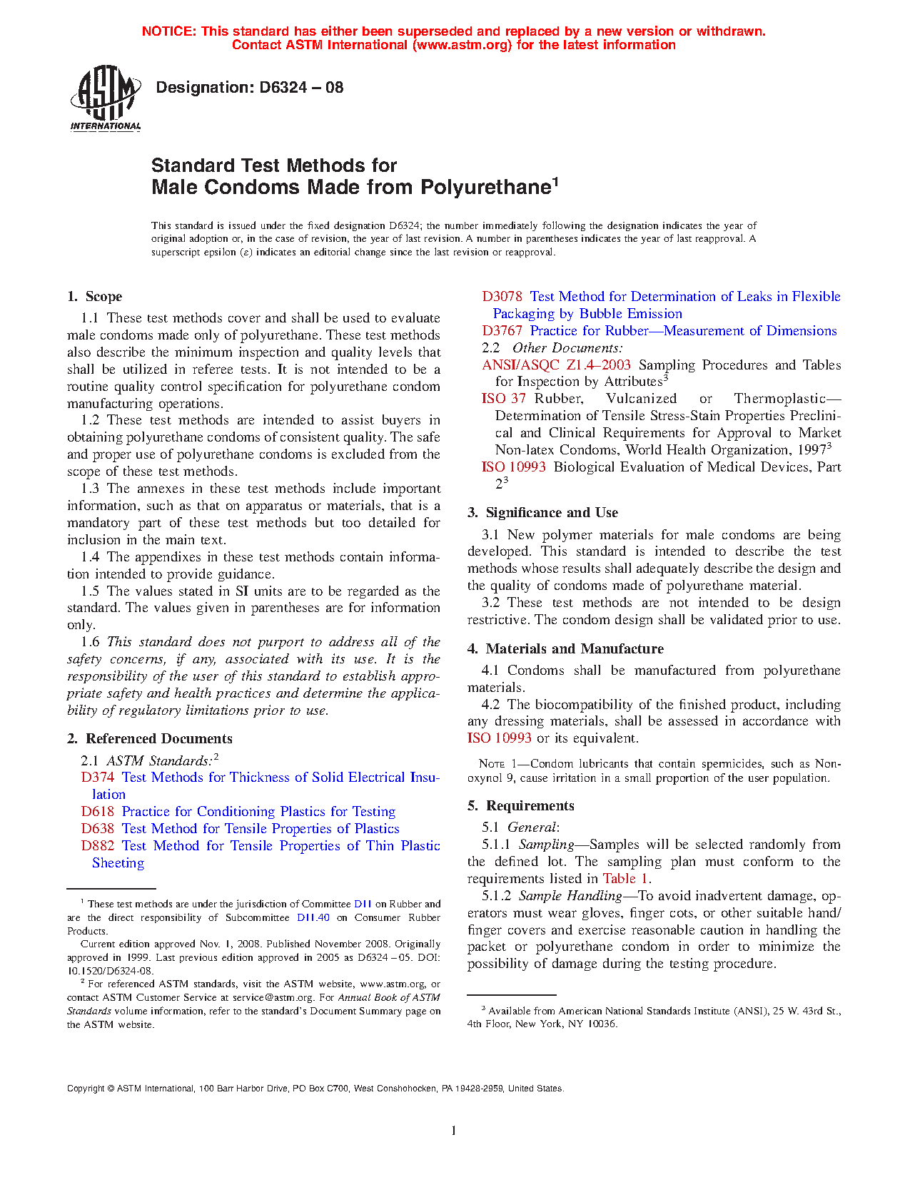 1.6 It shall be the responsibility of the manufacturer for any condom design that falls outside the specifications of this standard to determine testing methodology and substantiate the appropriateness of that methodology to assure the quality of the condoms to the purchaser and to the government regulatory authority having jurisdiction.