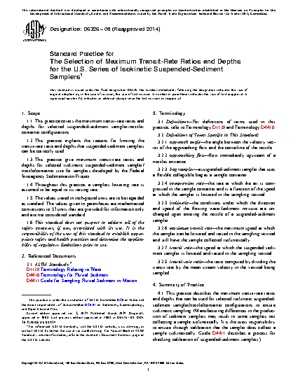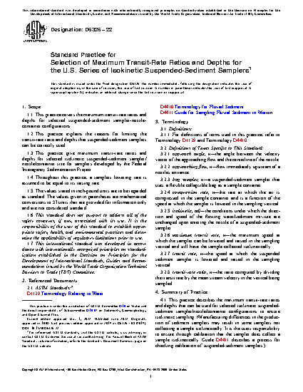 1.3 This practice gives maximum transit-rate ratios and depths for selected isokinetic suspended-sediment sampler/nozzle/container size for samplers developed by the Federal Interagency Sedimentation Project.