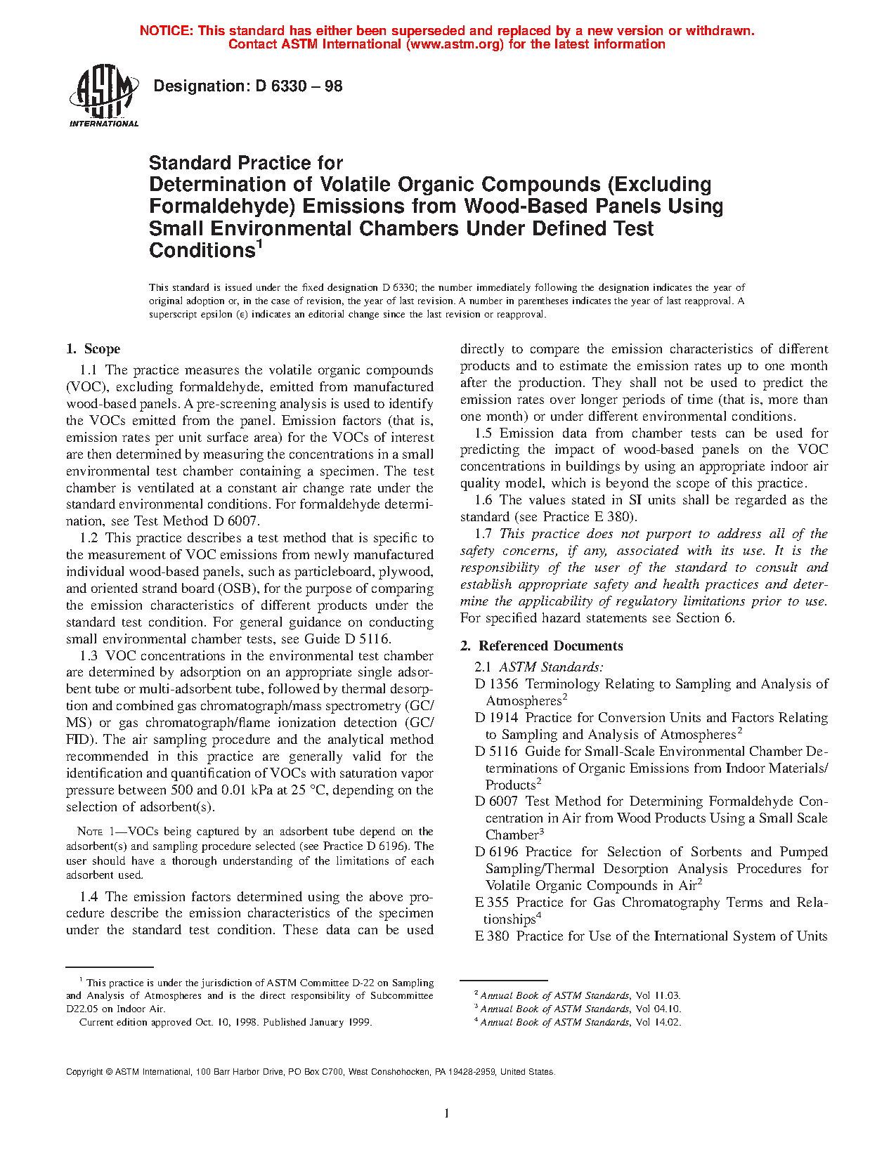 1.2 This practice describes a test method that is specific to the measurement of VOC emissions from newly manufactured individual wood-based panels, such as particleboard, plywood, and oriented strand board (OSB), for the purpose of comparing the emission characteristics of different products under the standard test condition. For general guidance on conducting small environmental chamber tests, see Guide D5116.