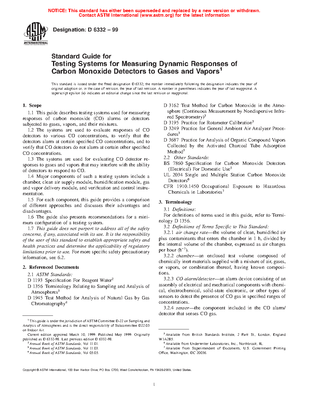 5.1 This guide provides information on testing systems and their components used for measuring responses of CO alarms or detectors subjected to gases, vapors, and their mixtures. Components of a testing system include a chamber, clean air supply module, humidification module, gas and vapor delivery module, and verification and control instrumentation.