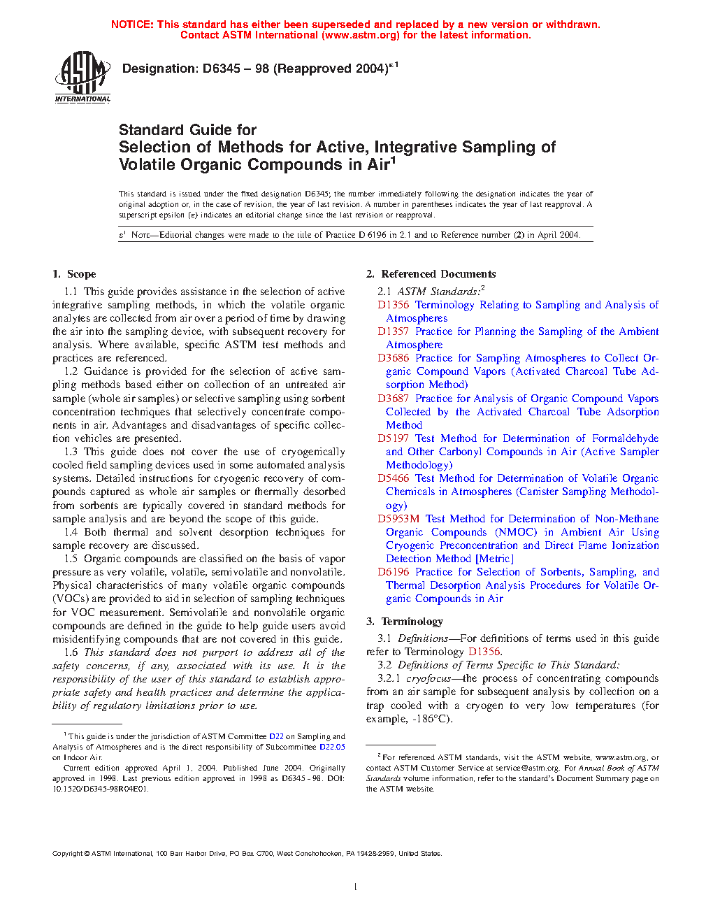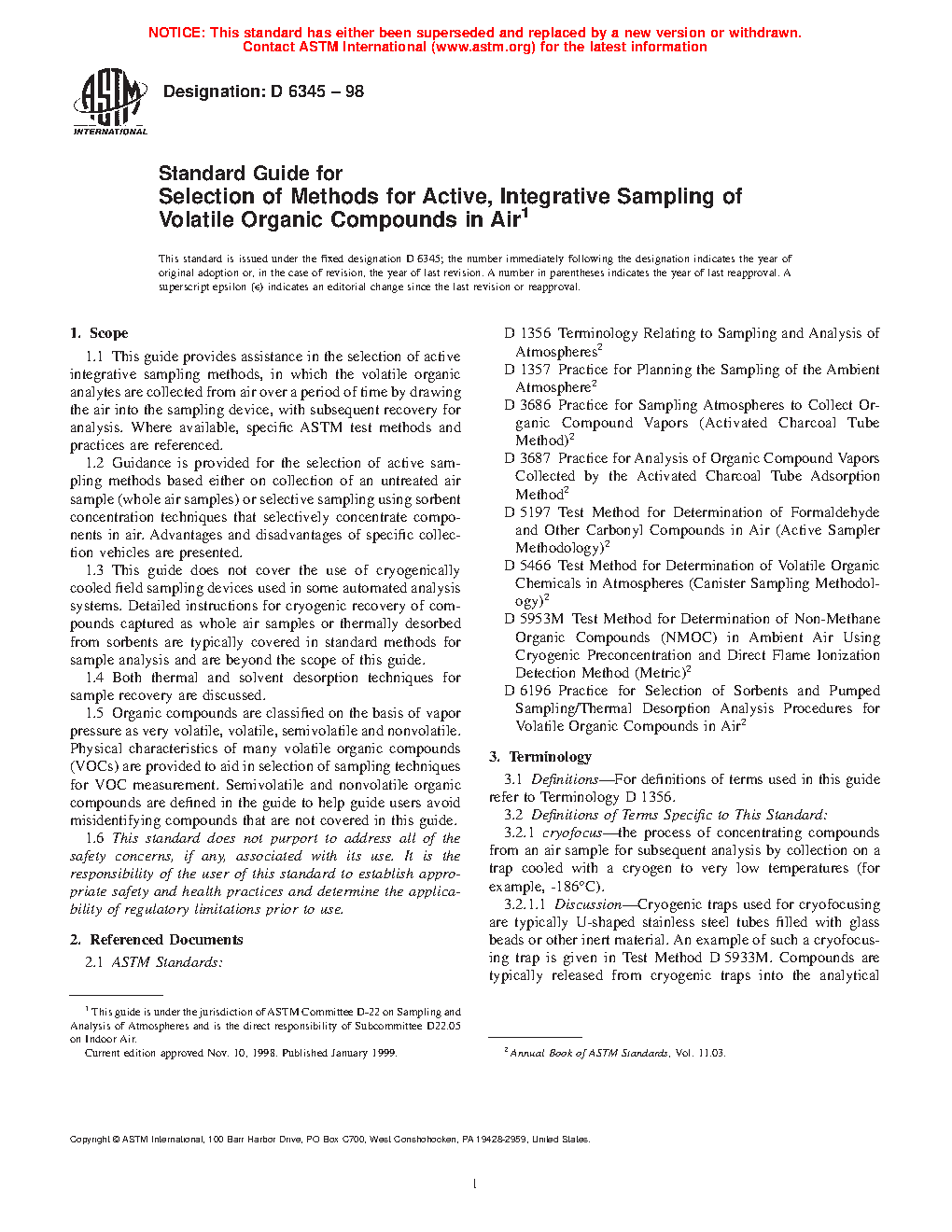 1.3 This guide does not cover the use of cryogenically cooled field sampling devices used in some automated analysis systems. Detailed instructions for cryogenic recovery of compounds captured as whole air samples or thermally desorbed from sorbents are typically covered in standard methods for sample analysis and are beyond the scope of this guide.