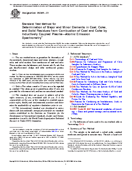 1.1 This test method covers a procedure for the analysis of the commonly determined major and minor elements in coal, coke, and solid residues from combustion of coal and coke. These residues may be laboratory ash, bottom ash, fly ash, flue gas desulfurization sludge, and other combustion process residues.