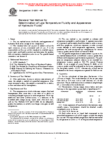 1.1 This test method covers the fluidity and appearance of hydraulic fluids after storage at low temperature.