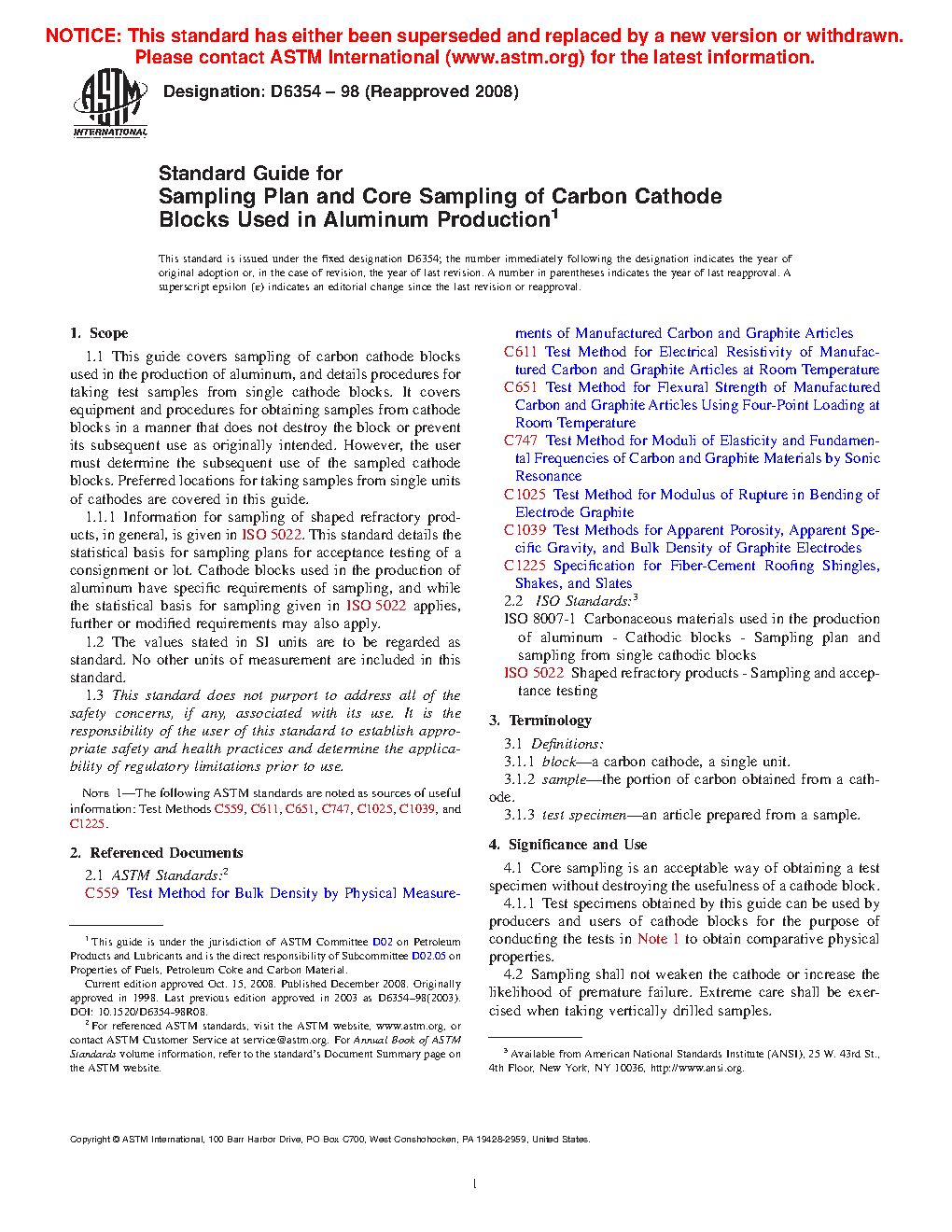 1.1.1 Information for sampling of shaped refractory products, in general, is given in ISO 5022. This standard details the statistical basis for sampling plans for acceptance testing of a consignment or lot. Cathode blocks used in the production of aluminum have specific requirements of sampling, and while the staistical basis or sampling given in ISO 5022 applies, further or modified requirements may, also, apply.
