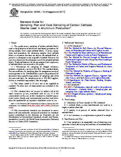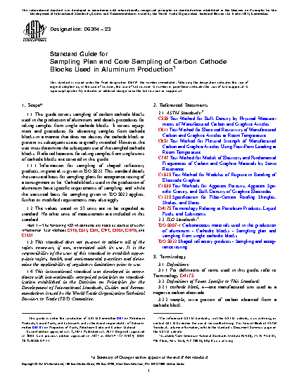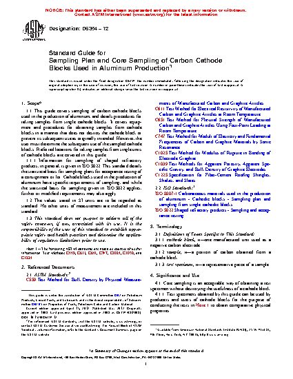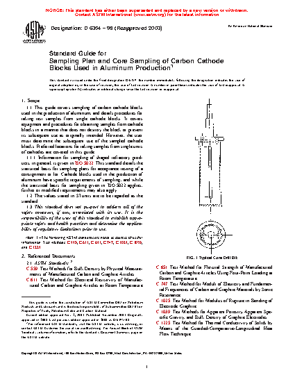 1.1 This sampling guide was developed for carbon cathode blocks used in the production of aluminum, and details procedures for taking test samples from single cathode blocks. It covers equipment and procedures for obtaining samples from cathode blocks in a manner that does not destroy the block or prevent its subsequent use as originally intended. However, the user must determine the subsequent use of the sampled cathode blocks. Preferred locations for taking samples from single units of cathodes are covered in this guide.