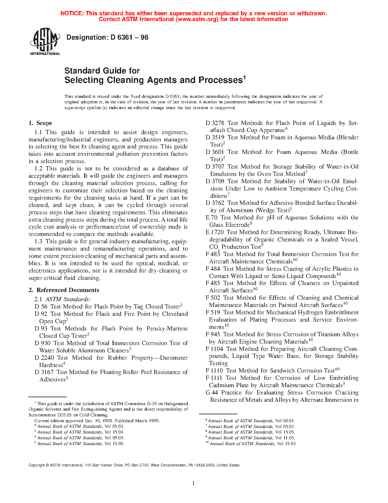 This guide is to be used by anyone developing cleaning requirements for specifications for manufacturing, maintenance, or overhaul. This guide has been designed to be application specific for each cleaning task and to assure the design engineer that the process selected by the industrial or manufacturing engineer will be compatible with both the part material and the subsequent process(es). This guide allows the industrial or manufacturing engineer to customize the selection of the cleaning product based on the materials of the part being cleaned; the cleanliness required for the subsequent process(es); and the environmental, cost, and health and safety concerns.