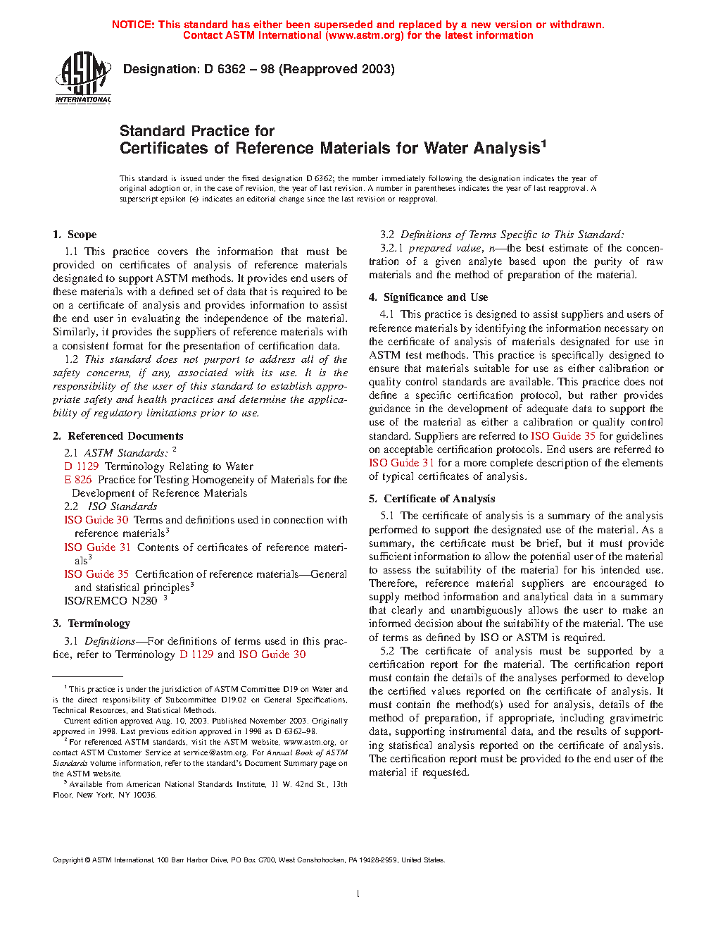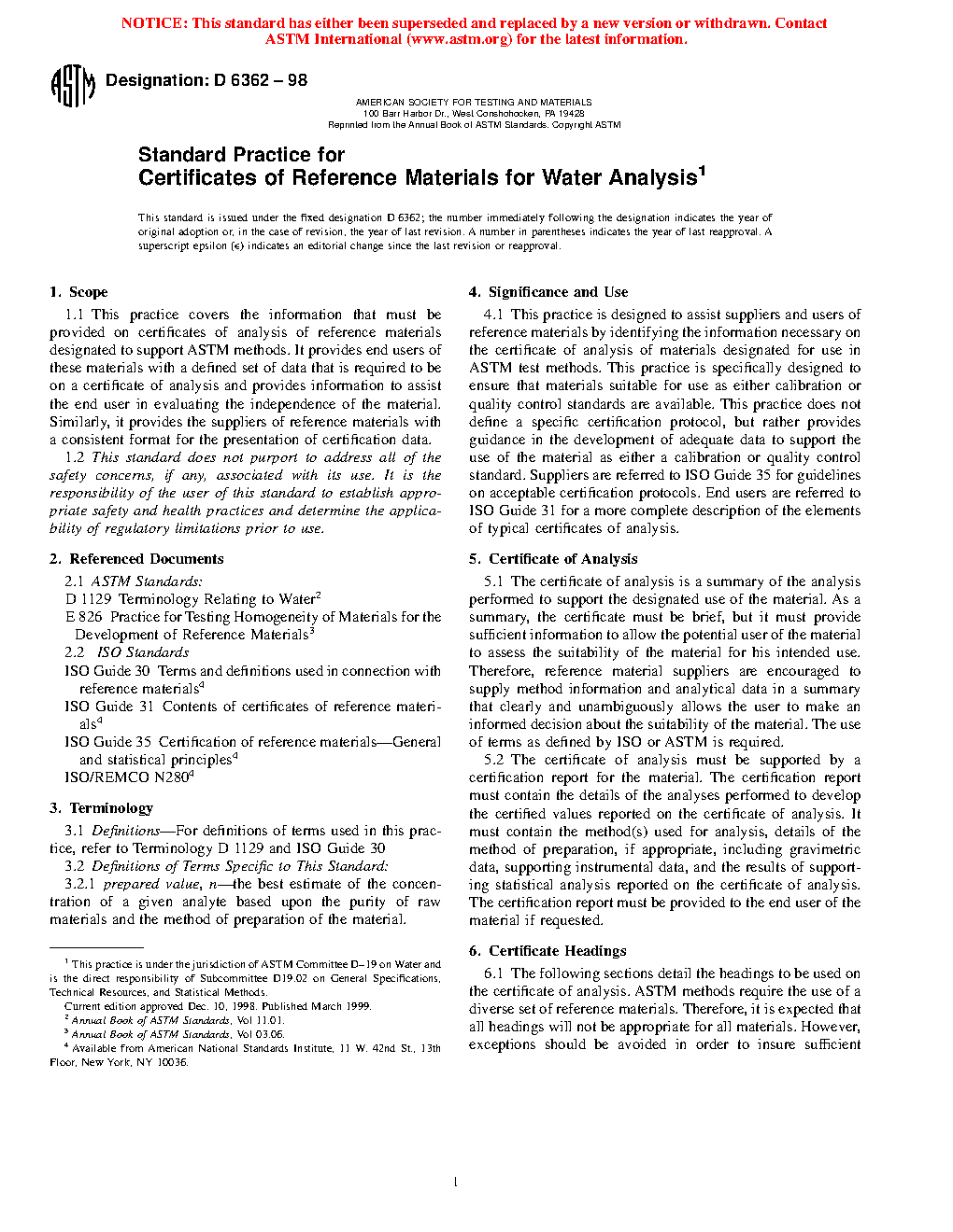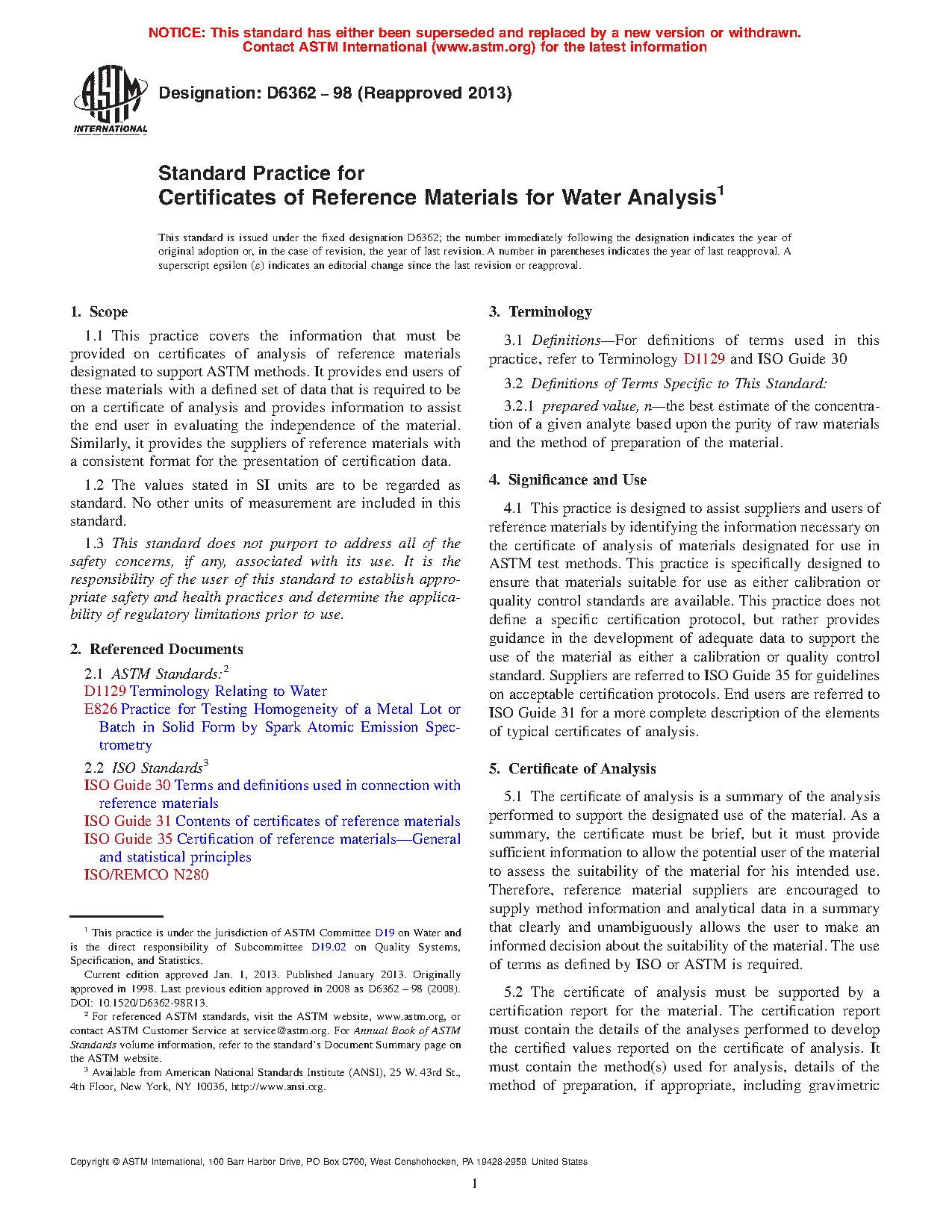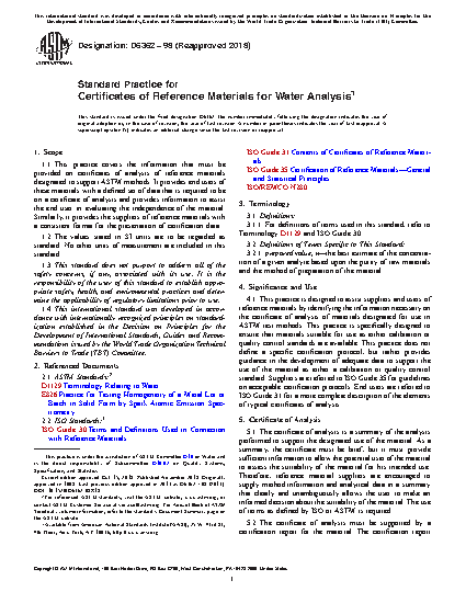 4.1 This practice is designed to assist suppliers and users of reference materials by identifying the information necessary on the certificate of analysis of materials designated for use in ASTM test methods. This practice is specifically designed to ensure that materials suitable for use as either calibration or quality control standards are available. This practice does not define a specific certification protocol, but rather provides guidance in the development of adequate data to support the use of the material as either a calibration or quality control standard. Suppliers are referred to ISO Guide 35 for guidelines on acceptable certification protocols. End users are referred to ISO Guide 31 for a more complete description of the elements of typical certificates of analysis.