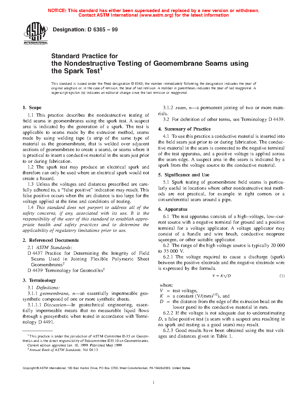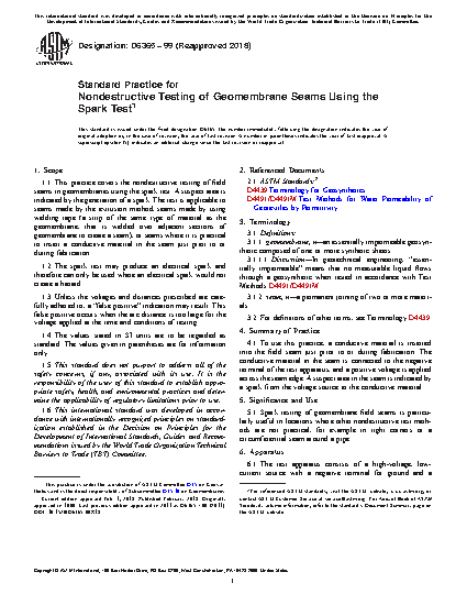 1.1 This practice covers the nondestructive testing of field seams in geomembranes using the spark test. A suspect area is indicated by the generation of a spark. The test is applicable to seams made by the extrusion method, seams made by using welding tape (a strip of the same type of material as the geomembrane, that is welded over adjacent sections of geomembrane to create a seam), or seams where it is practical to insert a conductive material in the seam just prior to or during fabrication.