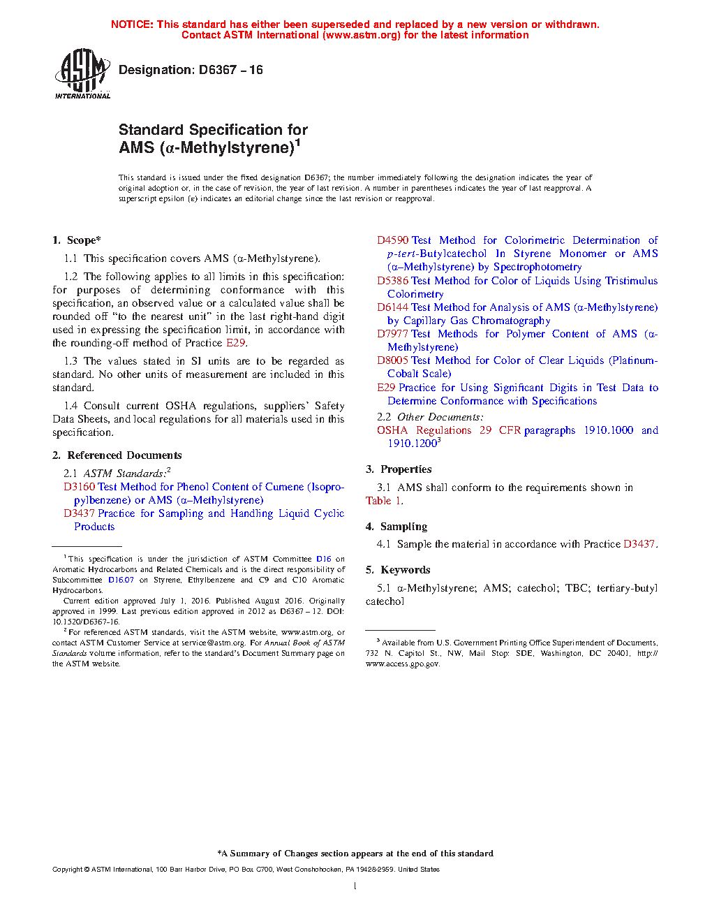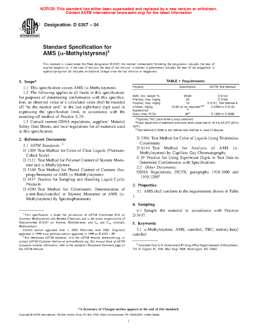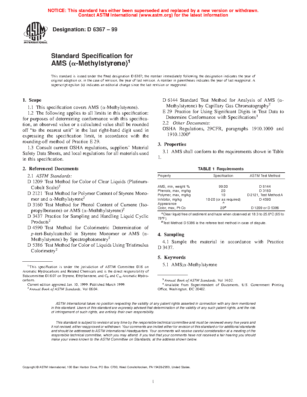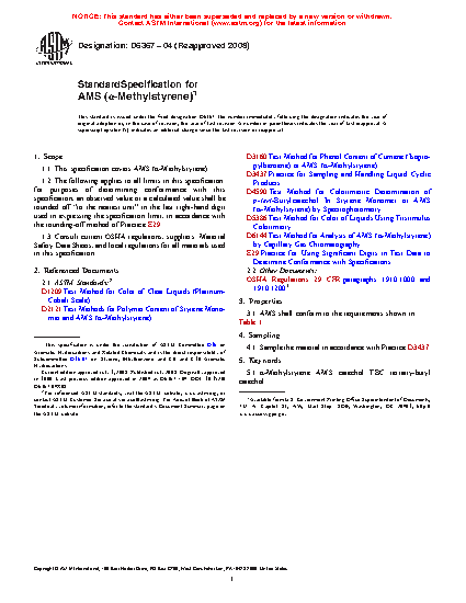 1.1 This specification covers AMS (a-Methylstyrene).
