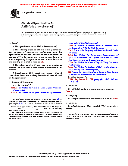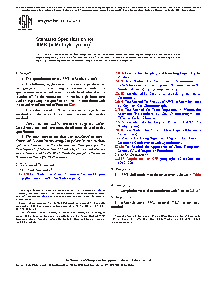 This specification establishes the requirements for AMS (alpha-Methylstyrene). Sampled specimens shall conform to the following physical and chemical properties: minimum AMS content; maximum phenol content; maximum polymer content; inhibitor content; appearance; and color (Pt-Co units).