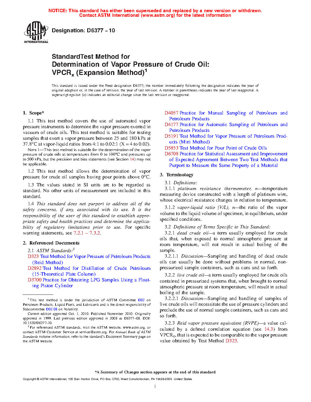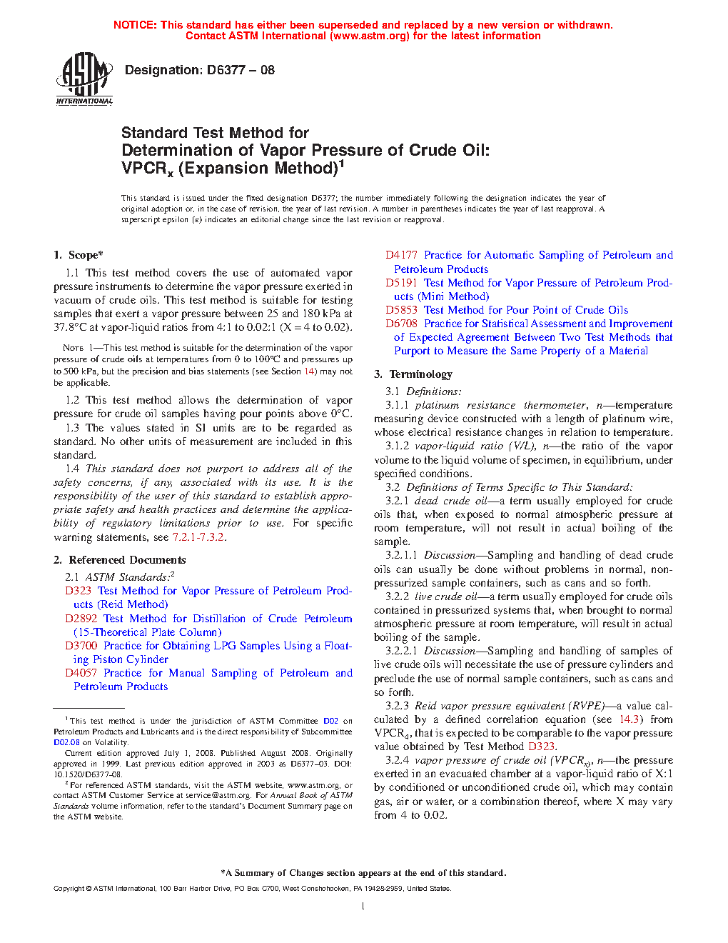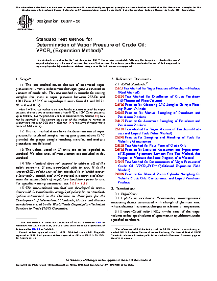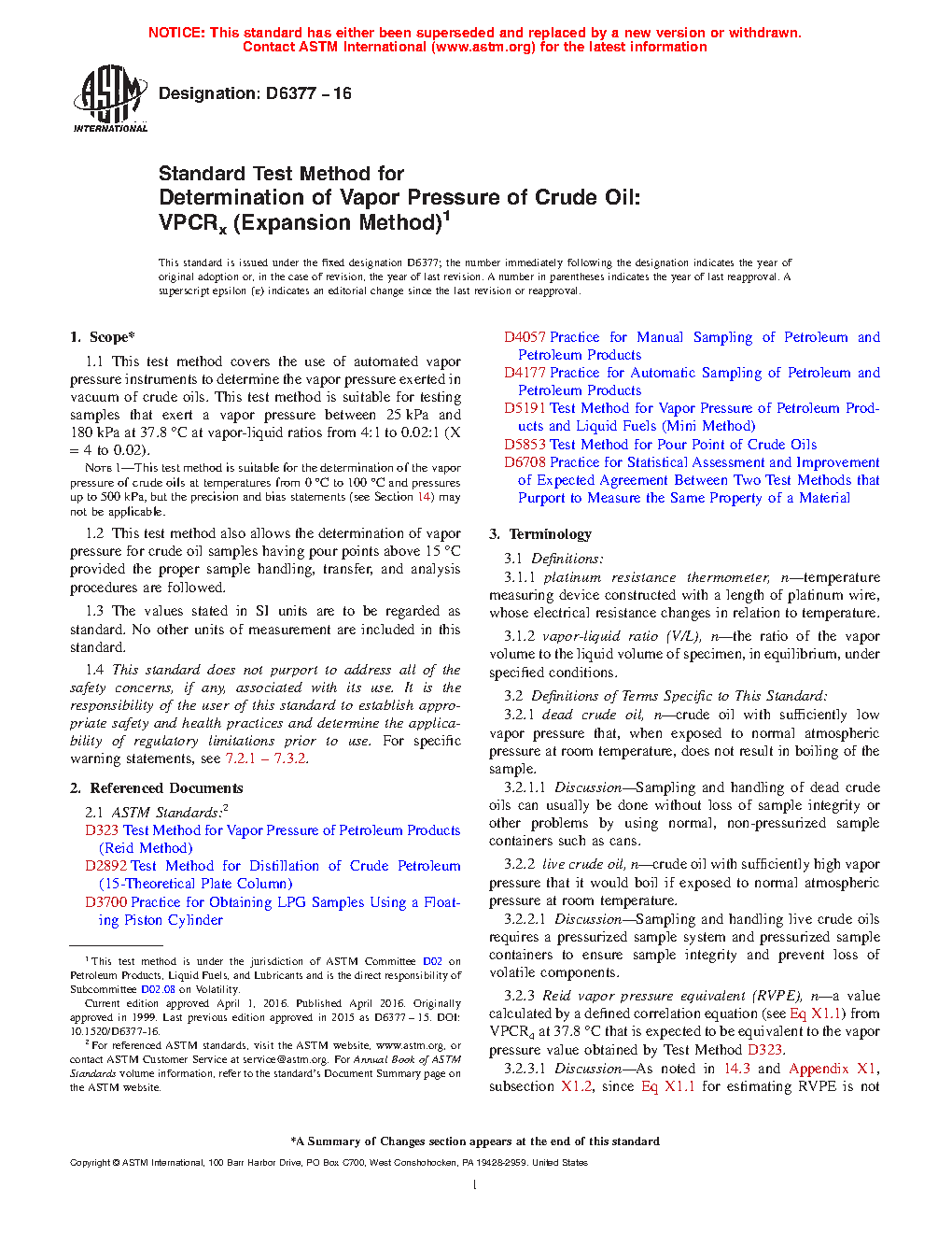 1.1 This test method covers the use of automated vapor pressure instruments to determine the vapor pressure exerted in vacuum of crude oils. This test method is suitable for testing samples that exert a vapor pressure between 25 and 180 kPa at 37.8°C at vapor-liquid ratios from 4:1 to 0.02:1 (X = 4 to 0.02).