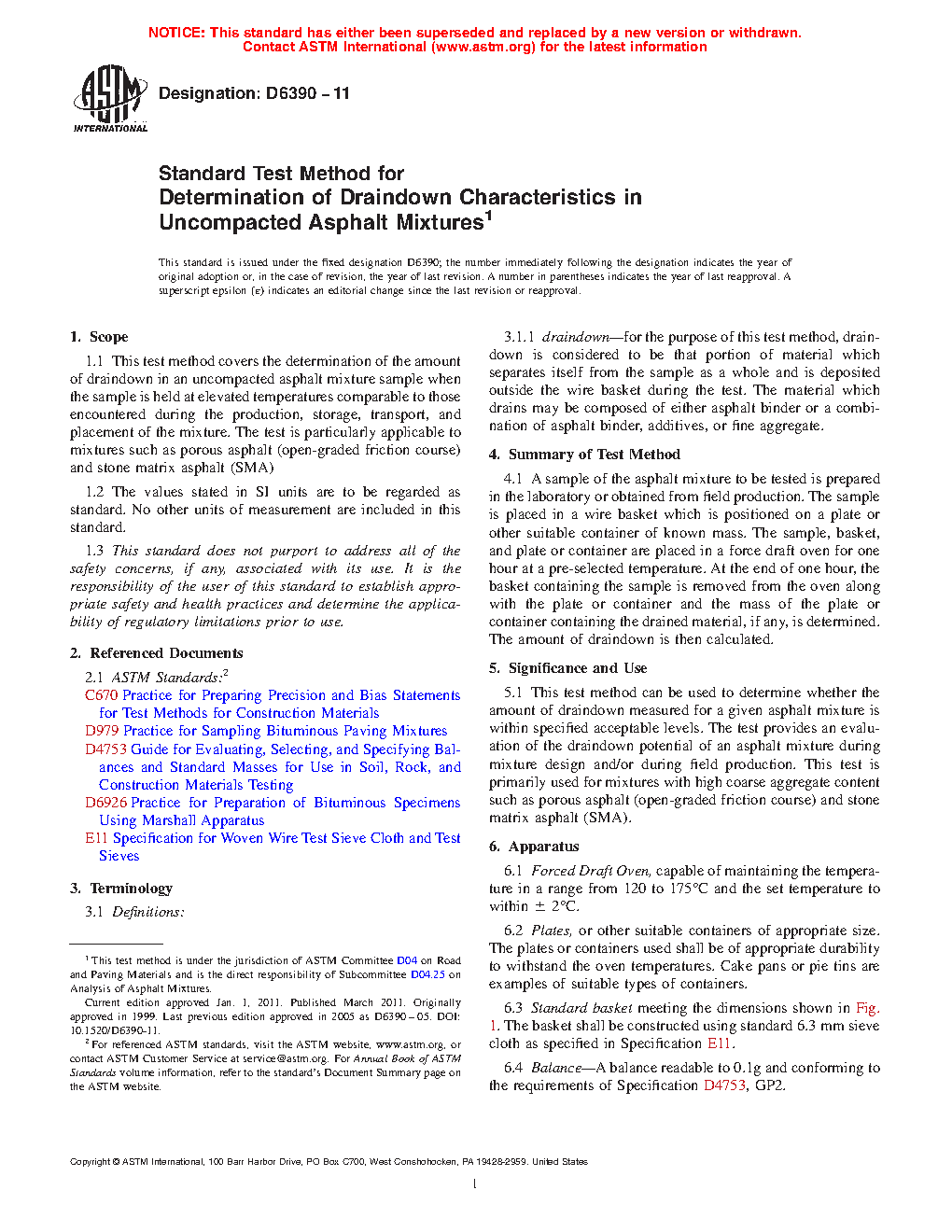 1.1 This test method covers the determination of the amount of draindown in an uncompacted asphalt mixture sample when the sample is held at elevated temperatures comparable to those encountered during the production, storage, transport, and placement of the mixture. The test is particularly applicable to mixtures such as porous asphalt (open-graded friction course) and stone matrix asphalt (SMA).