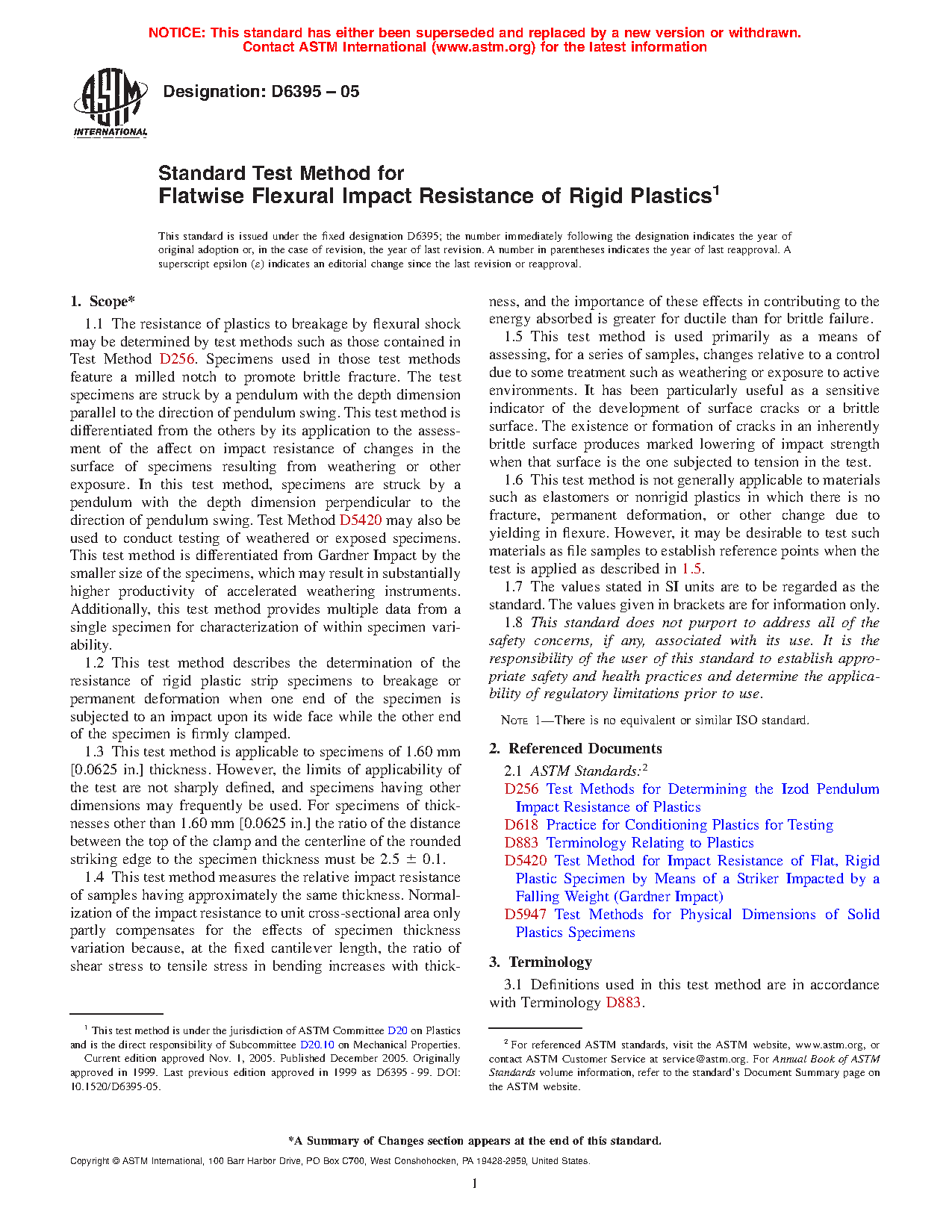 1.1 The resistance of plastics to breakage by flexural shock may be determined by test methods such as those contained in Test Method D256. Specimens used in those test methods feature a milled notch to promote brittle fracture. The test specimens are struck by a pendulum with the depth dimension parallel to the direction of pendulum swing. This test method is differentiated from the others by its application to the assessment of the affect on impact resistance of changes in the surface of specimens resulting from weathering or other exposure. In this test method, specimens are struck by a pendulum with the depth dimension perpendicular to the direction of pendulum swing. Test Method D5420 may also be used to conduct testing of weathered or exposed specimens. This test method is differentiated from Gardner Impact by the smaller size of the specimens, which may result in substantially higher productivity of accelerated weathering instruments. Additionally, this test method provides multiple data from a single specimen for characterization of within specimen variability.