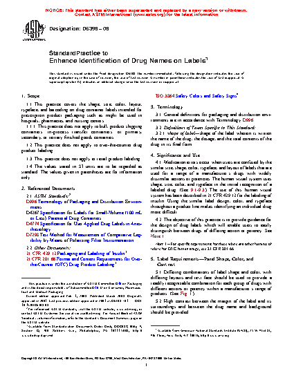 1.1 This practice covers the shape, size, color, layout, typeface, and barcoding on drug container labels intended for prescription product packaging such as might be used in hospitals, pharmacies, and nursing centers.