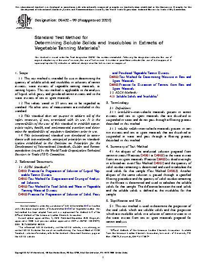 1.1 This test method is intended for use in determining the quantity of soluble solids and insolubles in solutions of tannin extracts, water extracts of vegetable tanning materials, or tanning liquors. This test method is applicable to the analysis of liquid, solid, pasty, and powdered tannin extracts and to the water extracts of raw or spent materials.