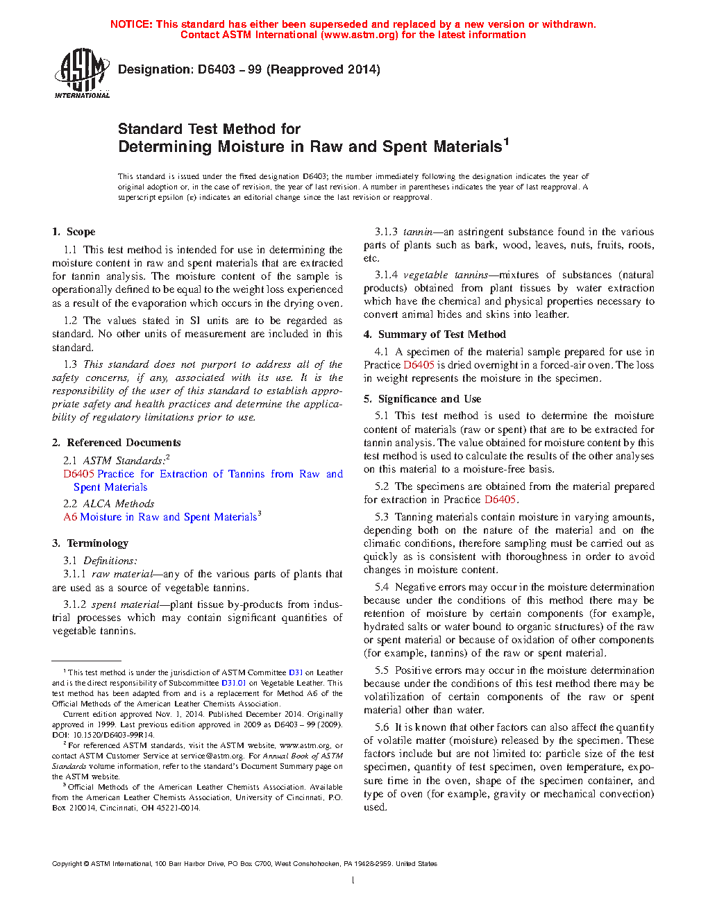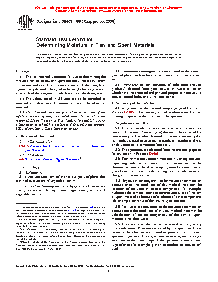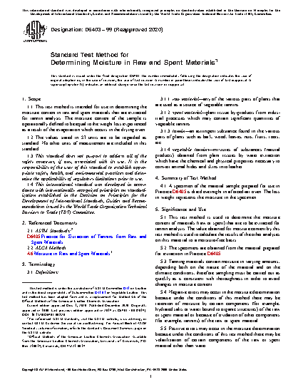 1.1 This test method is intended for use in determining the moisture content in raw and spent materials that are extracted for tannin analysis. The moisture content of the sample is operationally defined to be equal to the weight loss experienced as a result of the evaporation which occurs in the drying oven.
