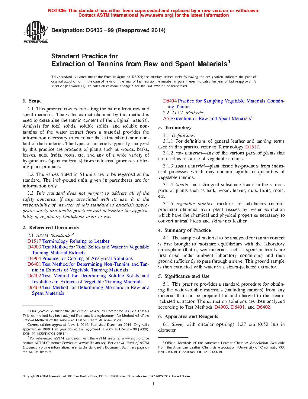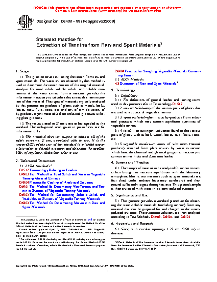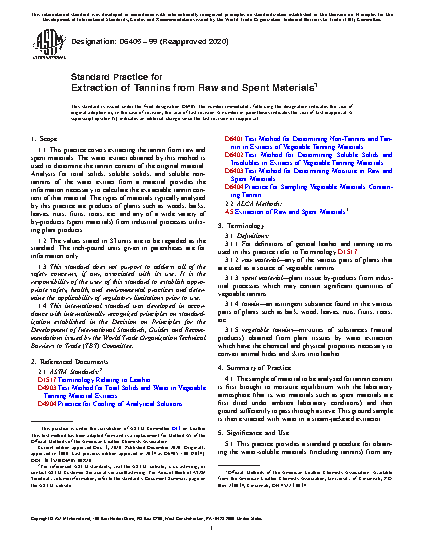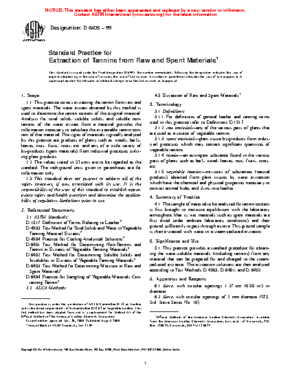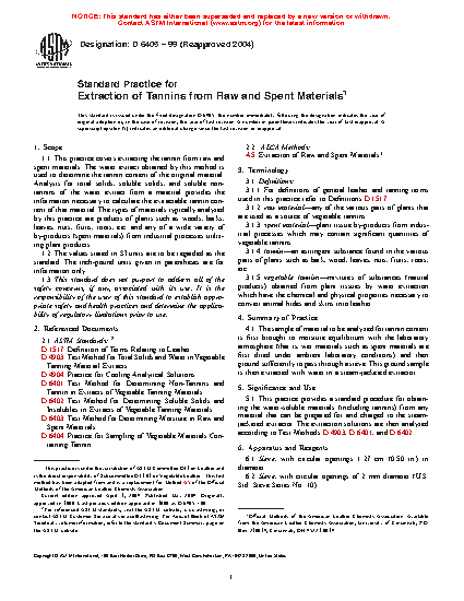 1.1 This practice covers extracting the tannin from raw and spent materials. The water extract obtained by this method is used to determine the tannin content of the original material. Analysis for total solids, soluble solids, and soluble non-tannins of the water extract from a material provides the information necessary to calculate the extractable tannin content of that material. The types of materials typically analyzed by this practice are products of plants such as woods, barks, leaves, nuts, fruits, roots, etc. and any of a wide variety of by-products (spent materials) from industrial processes utilizing plant products.