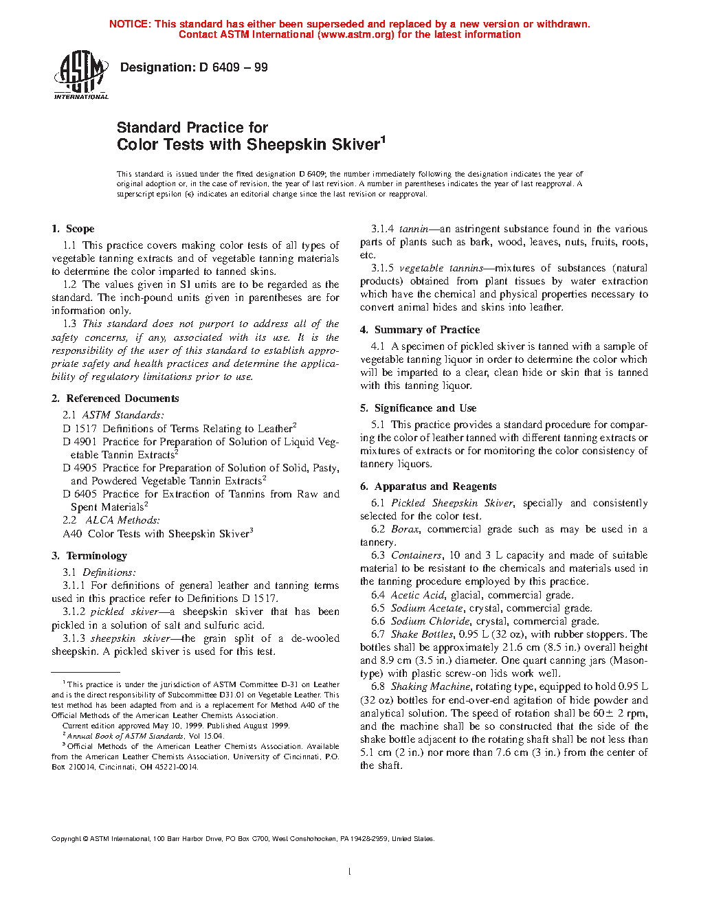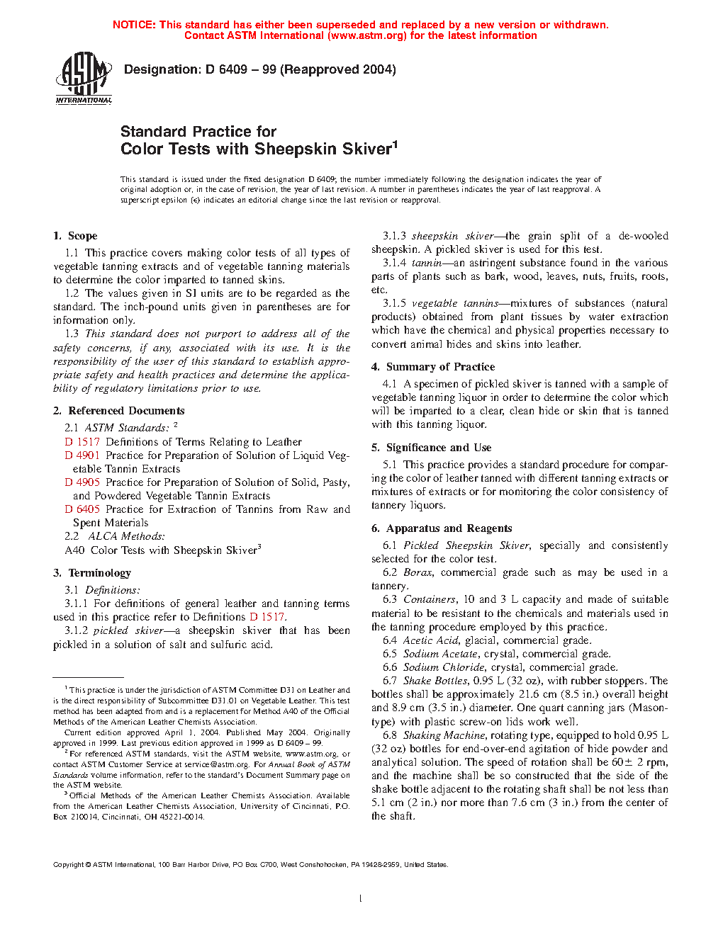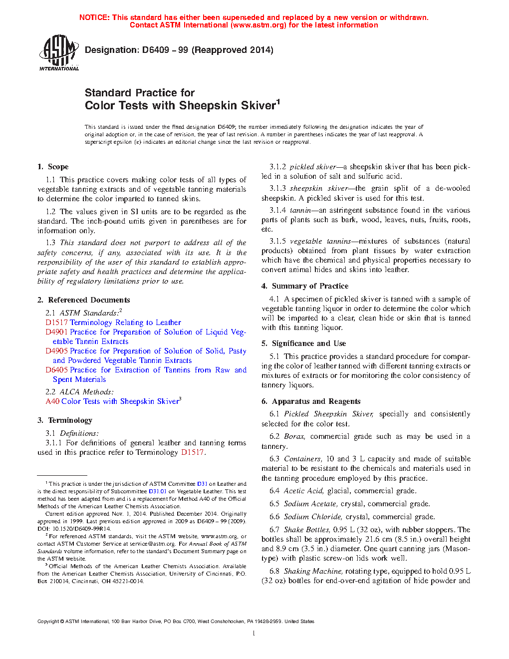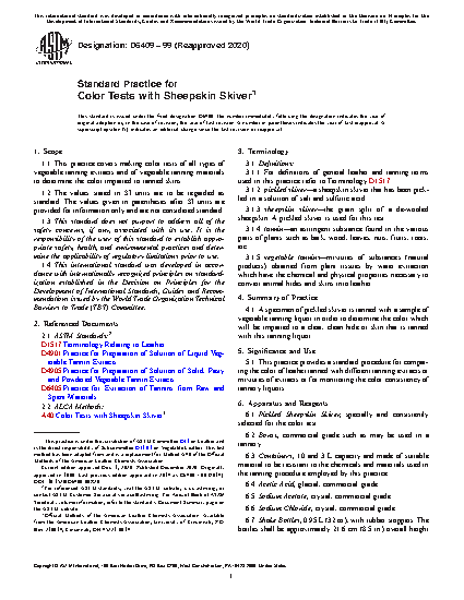 5.1 This practice provides a standard procedure for comparing the color of leather tanned with different tanning extracts or mixtures of extracts or for monitoring the color consistency of tannery liquors.