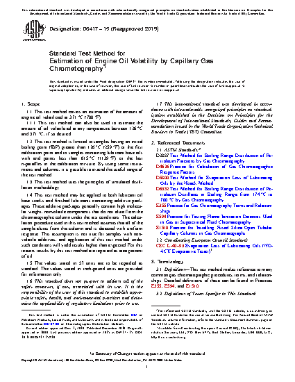 5.2 This test method is intended as an alternative to Test Methods D5800 and the Noack method for the determination of engine oil volatility (CEC L-40–93). The data obtained from this test method are not directly equivalent to Test Method D5800. The calculated results of the oil volatility estimation by this test method can be biased by the presence of additives (polymeric materials), which may not completely elute from the gas chromatographic column, or by heavier base oils not completely eluting from the column. The results of this test method may also not correlate with other oil volatility methods for nonhydrocarbon synthetic oils.