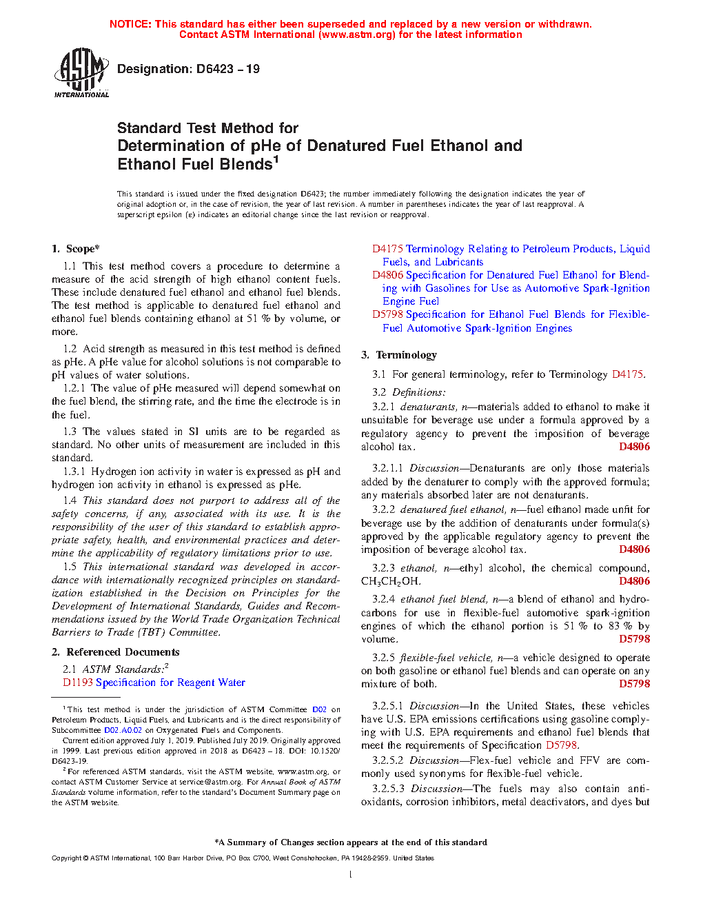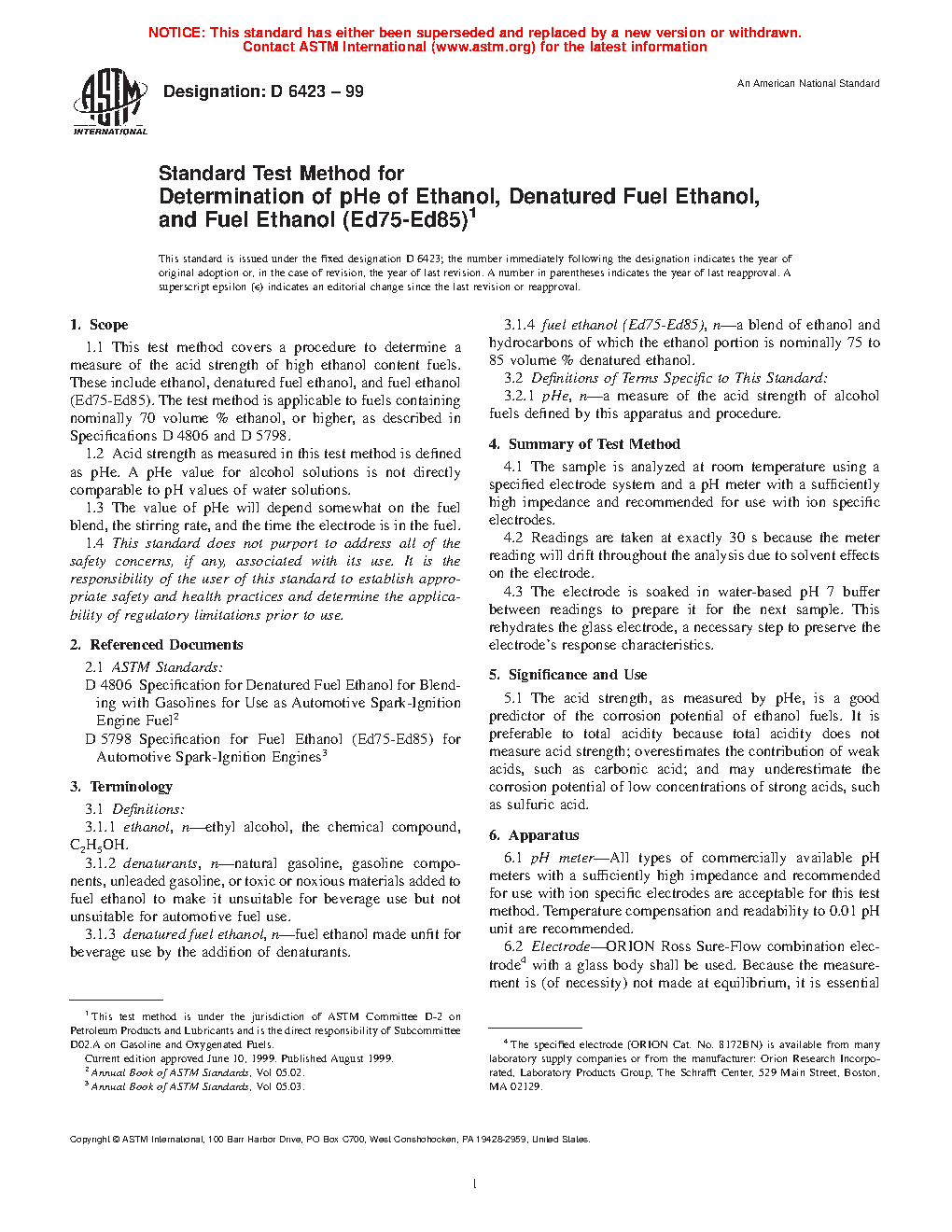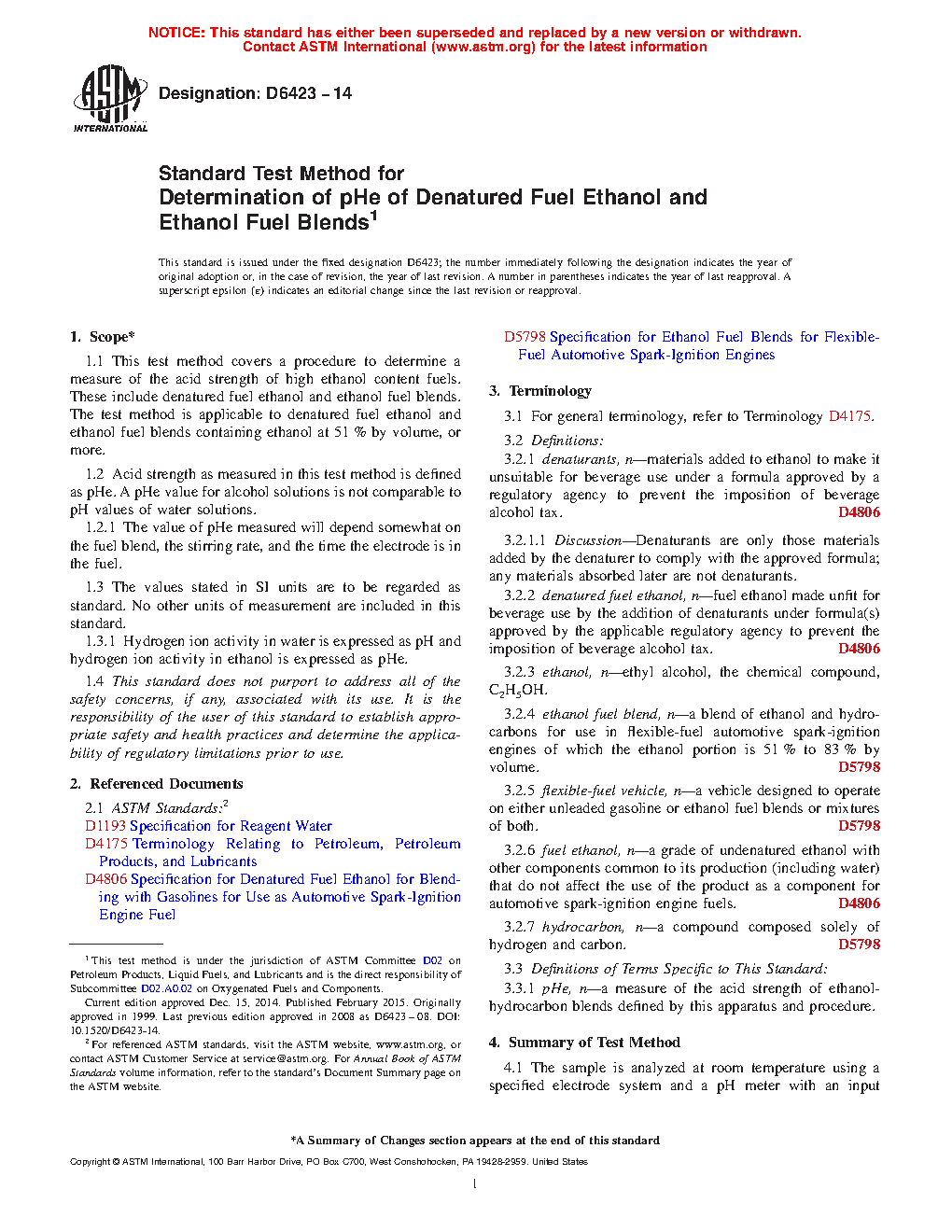 1.1 This test method covers a procedure to determine a measure of the hydrogen ion activity of high ethanol content fuels. These include denatured fuel ethanol and ethanol fuel blends. The test method is applicable to denatured fuel ethanol and ethanol fuel blends containing ethanol at 51 % by volume, or more.