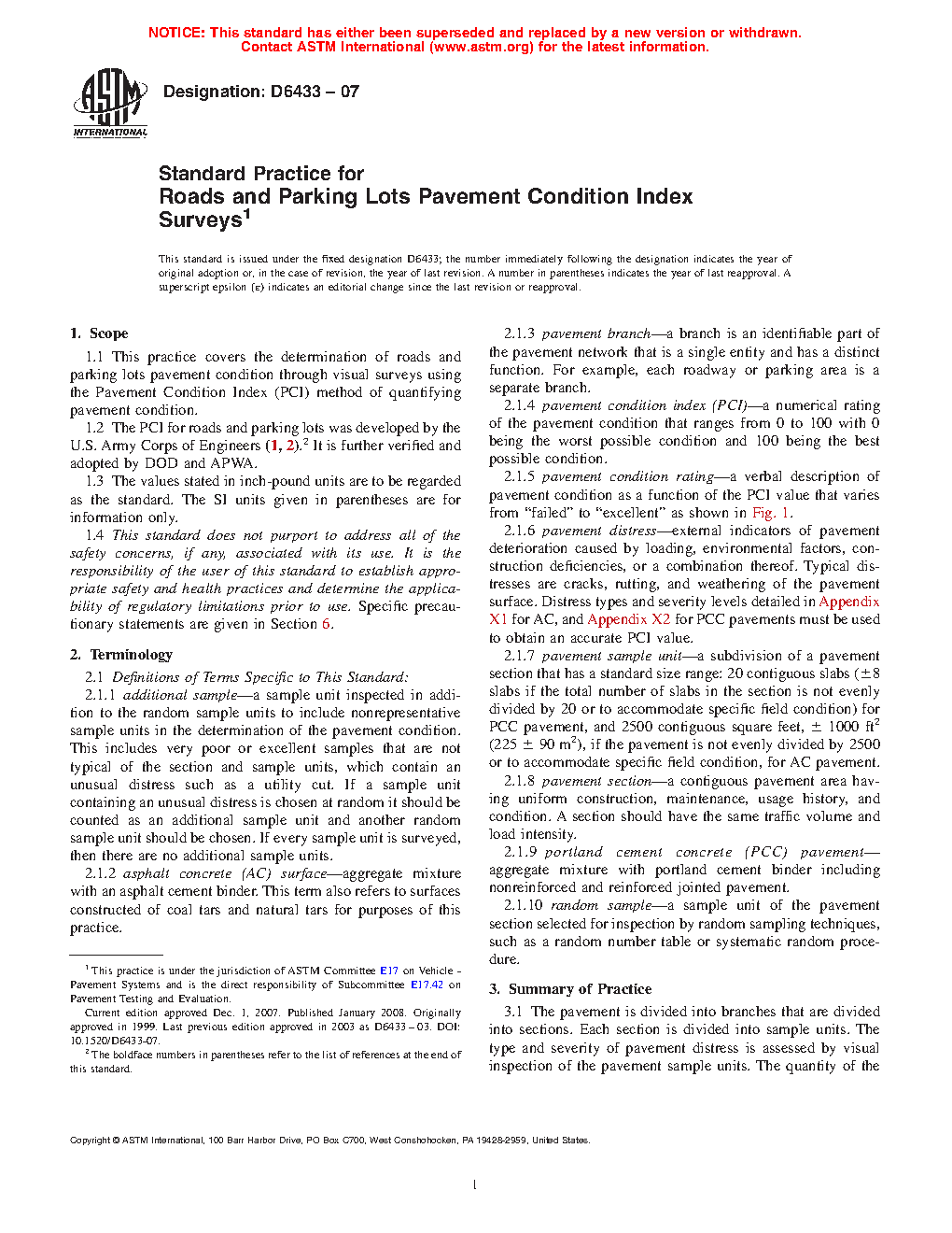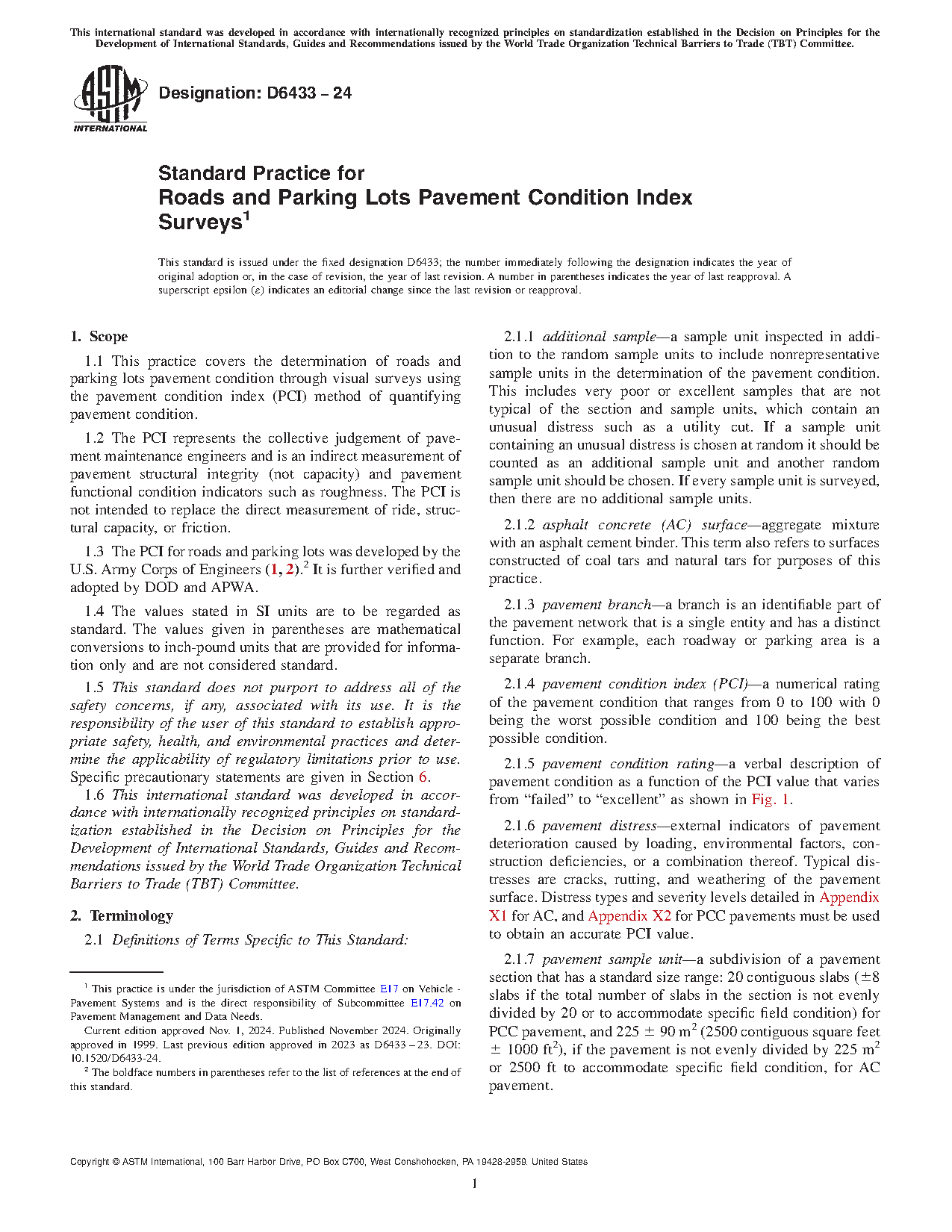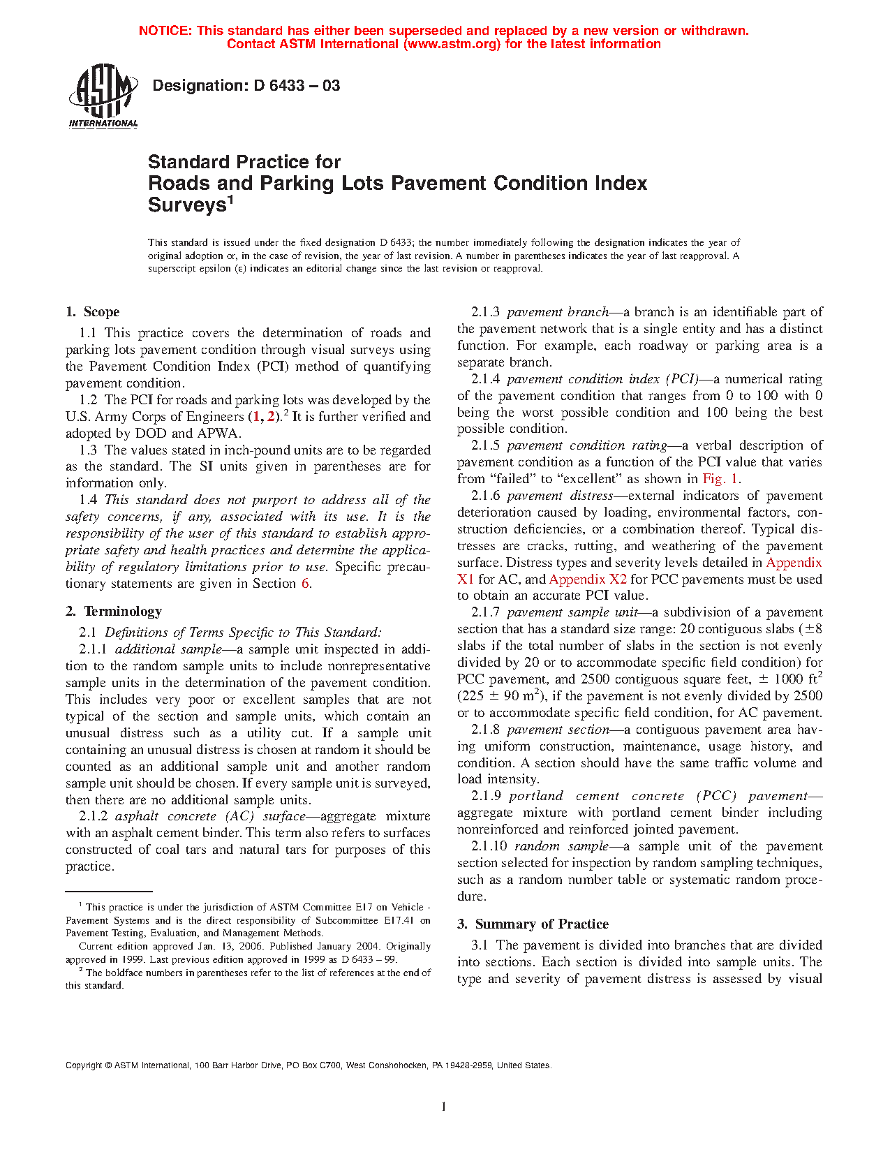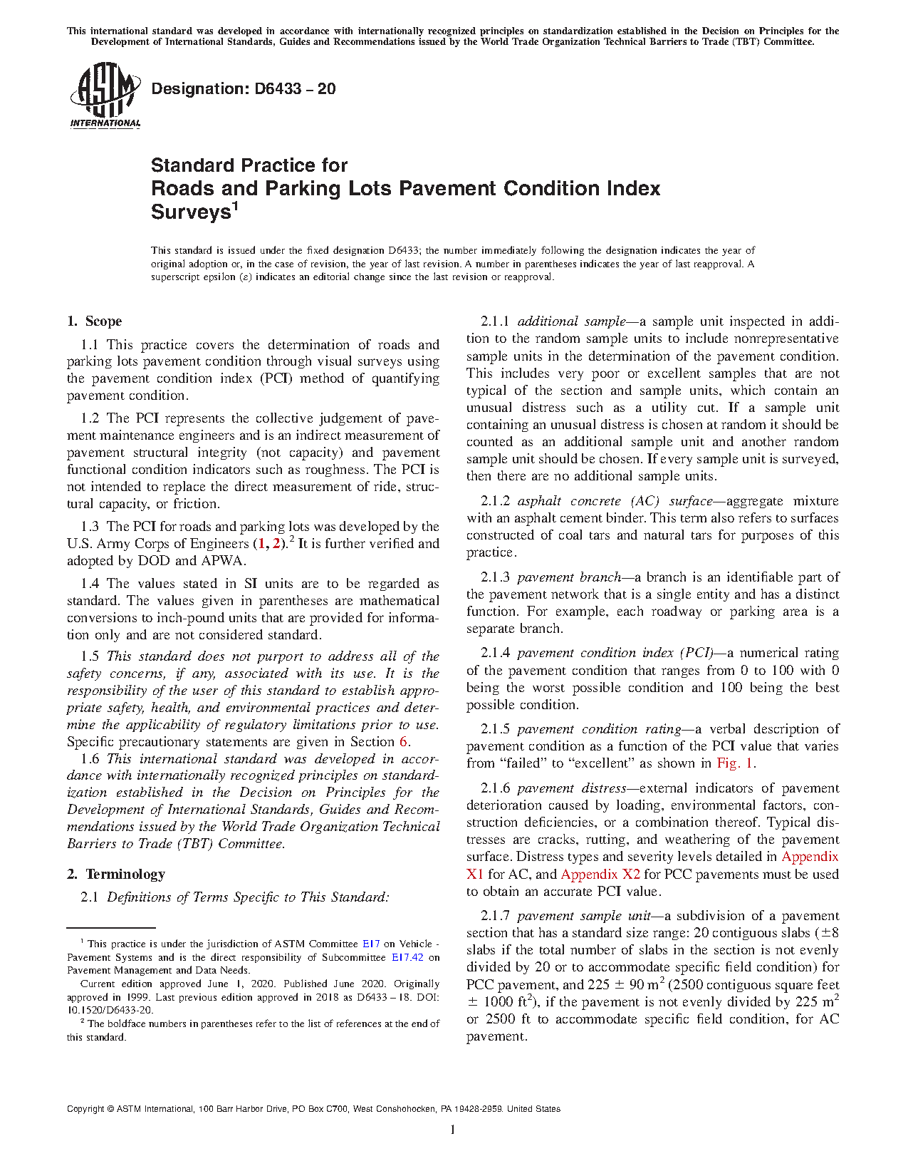 1.1 This practice covers the determination of roads and parking lots pavement condition through visual surveys using the Pavement Condition Index (PCI) method of quantifying pavement condition.