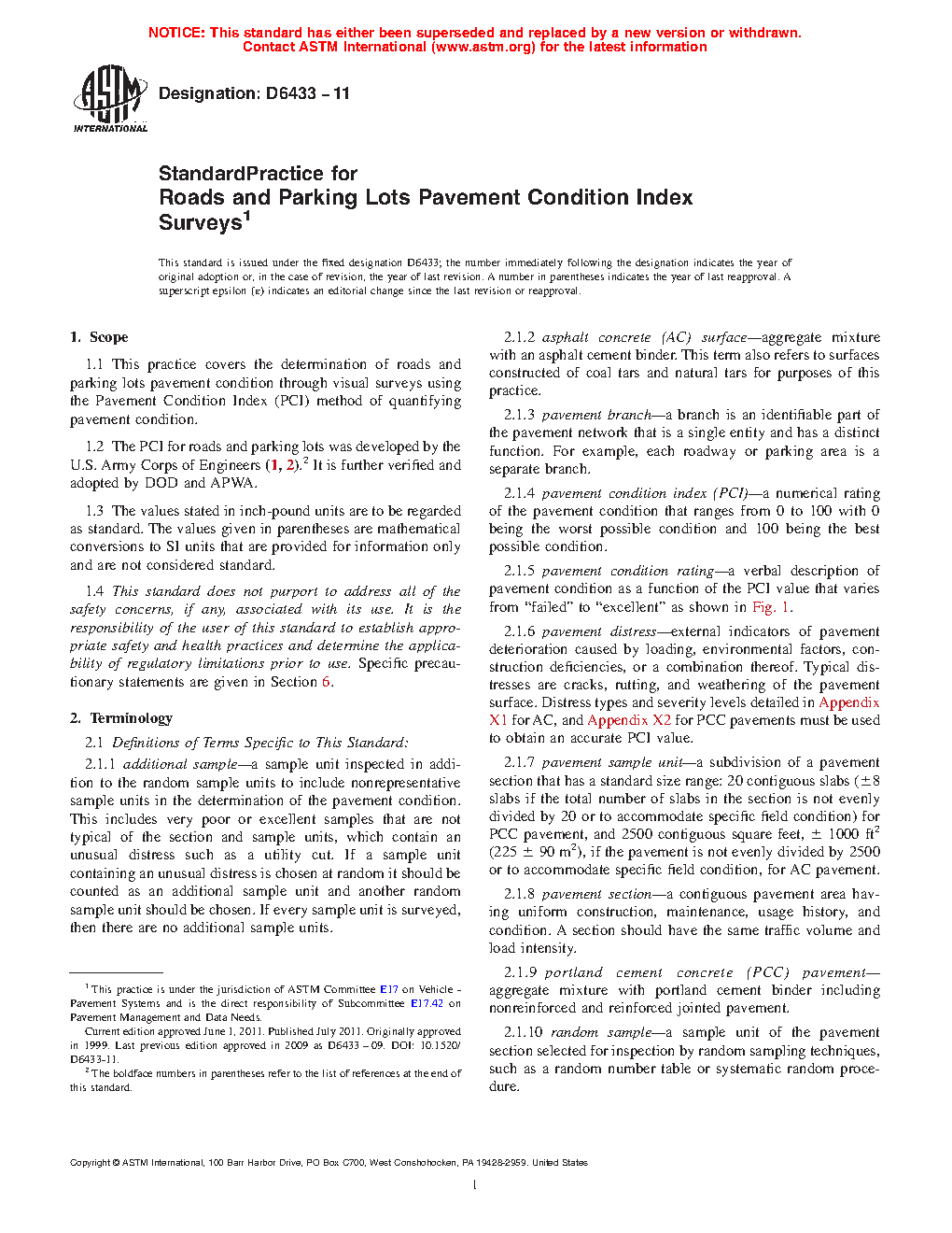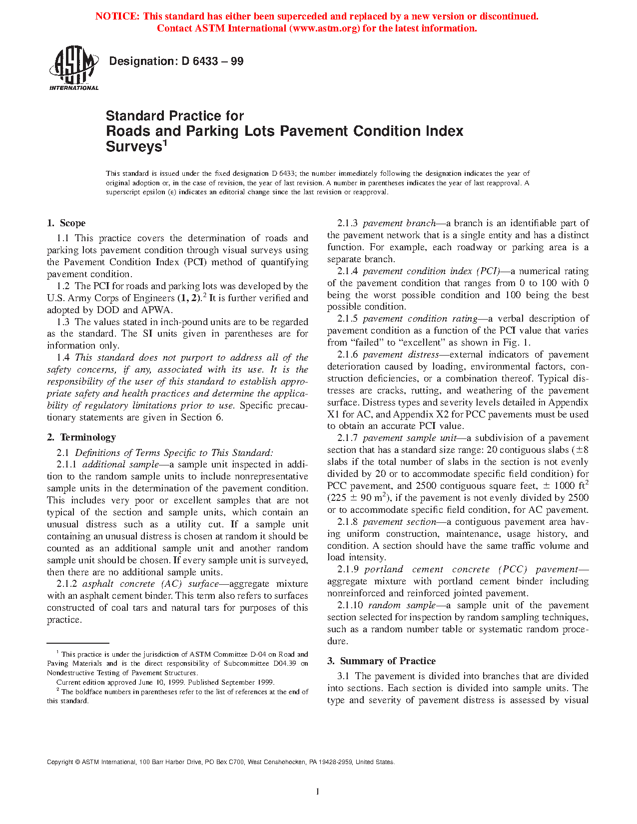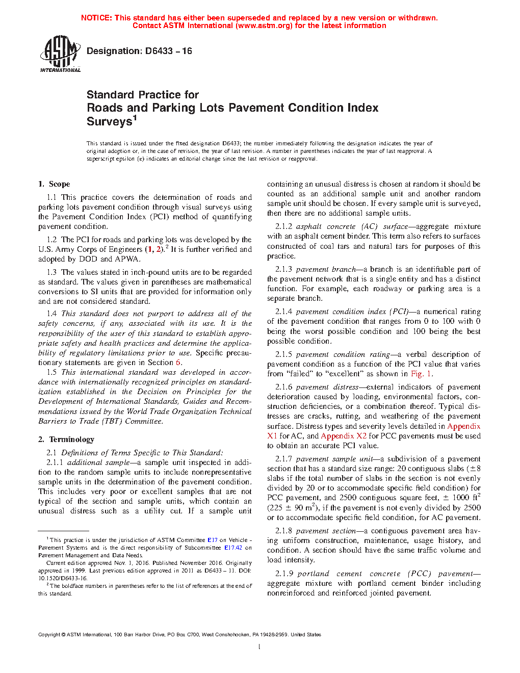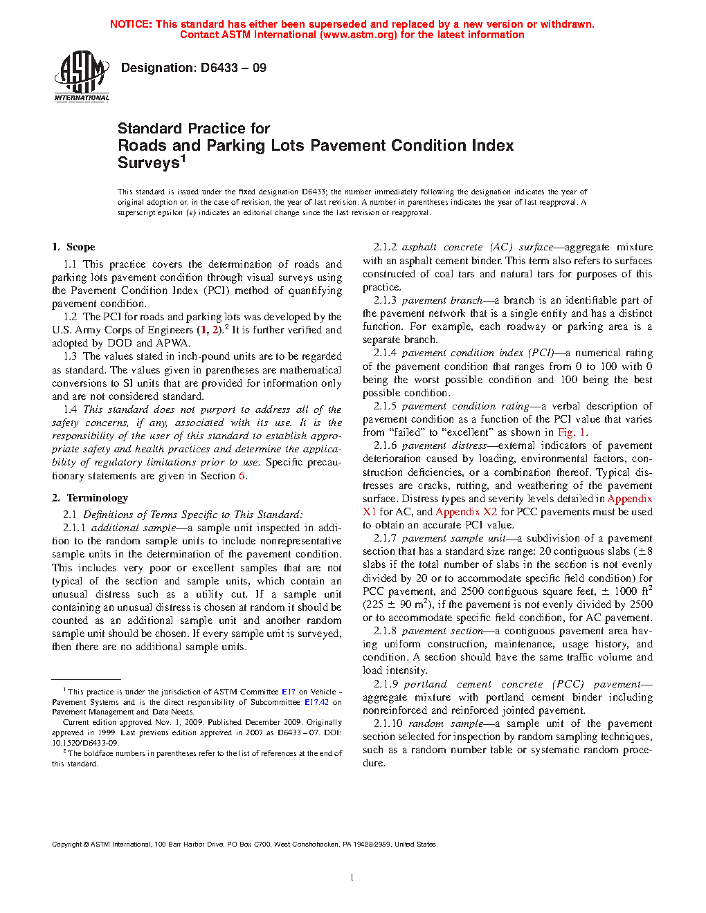 1.1 This practice covers the determination of roads and parking lots pavement condition through visual surveys using the Pavement Condition Index (PCI) method of quantifying pavement condition.