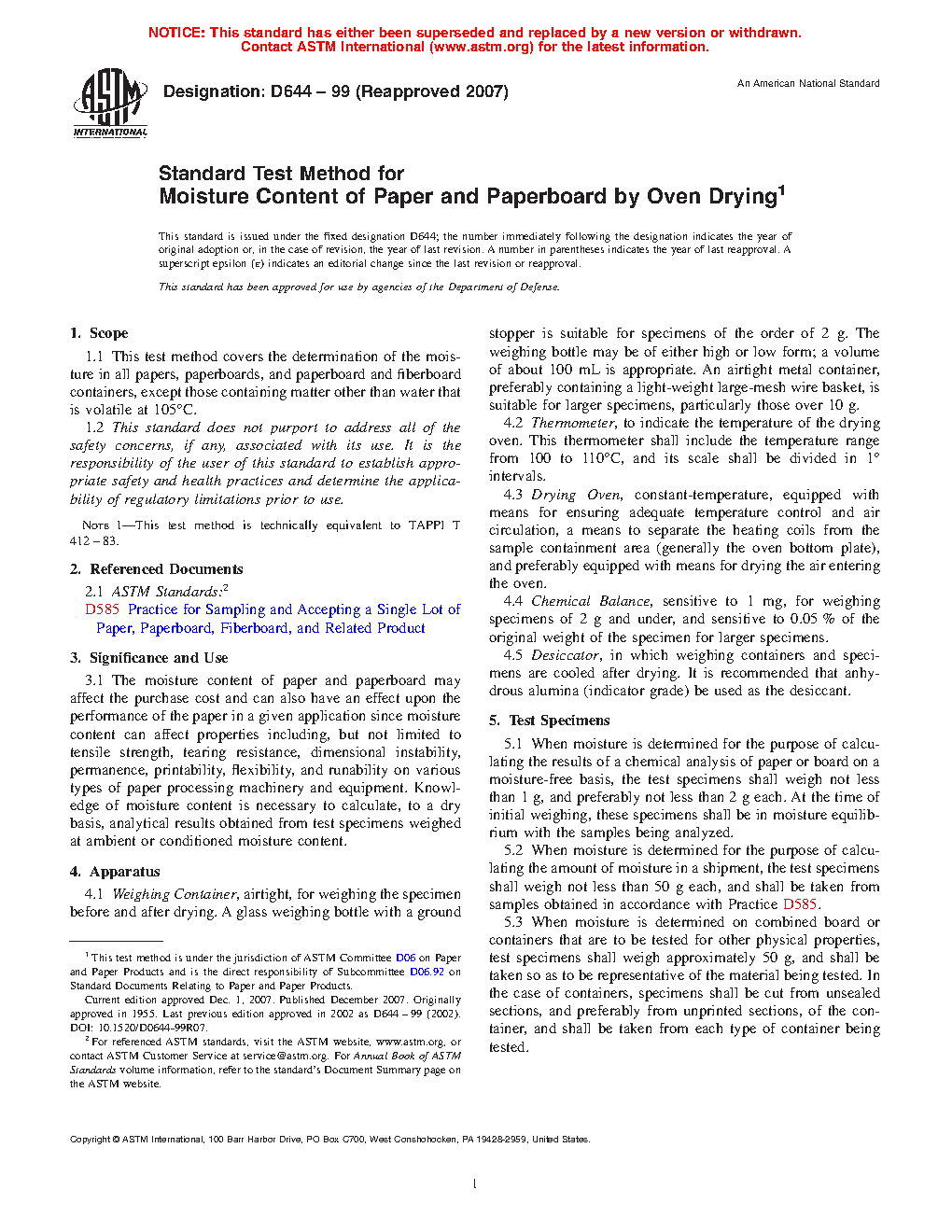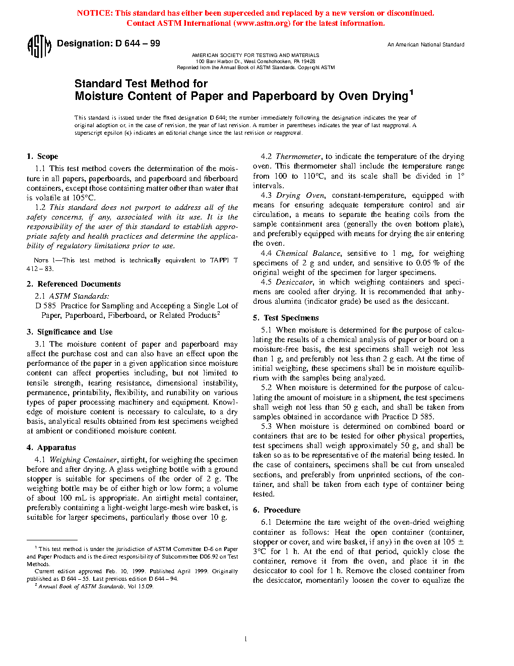 1.1 This test method covers the determination of the moisture in all papers, paperboards, and paperboard and fiberboard containers, except those containing matter other than water that is volatile at 105°C.