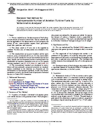 1.1 The test method covers the determination of the hydroperoxide content of aviation turbine fuels. The test method may also be applicable to the determination of the hydroperoxide content of any water-insoluble, organic fluid, particularly diesel fuels, gasolines, and kerosines.