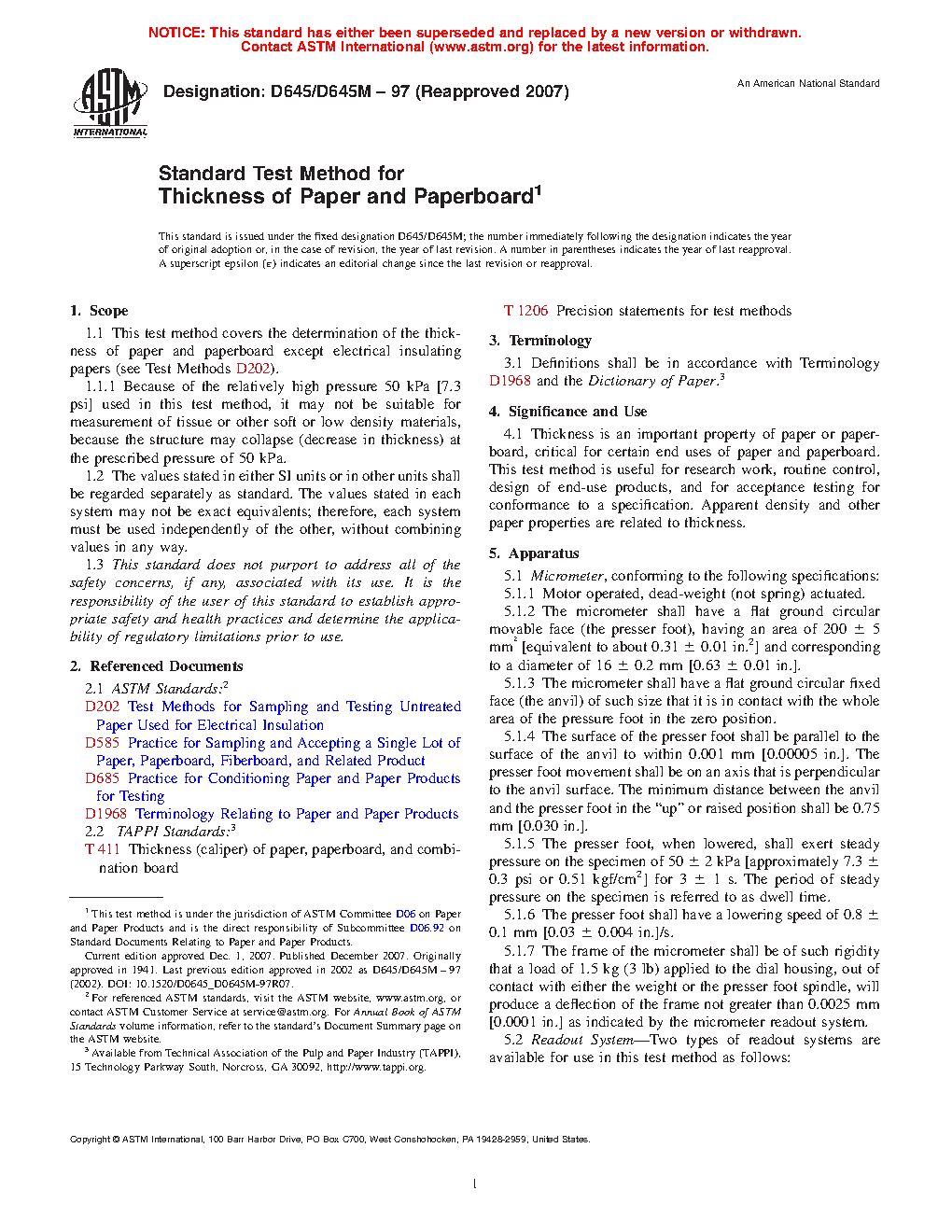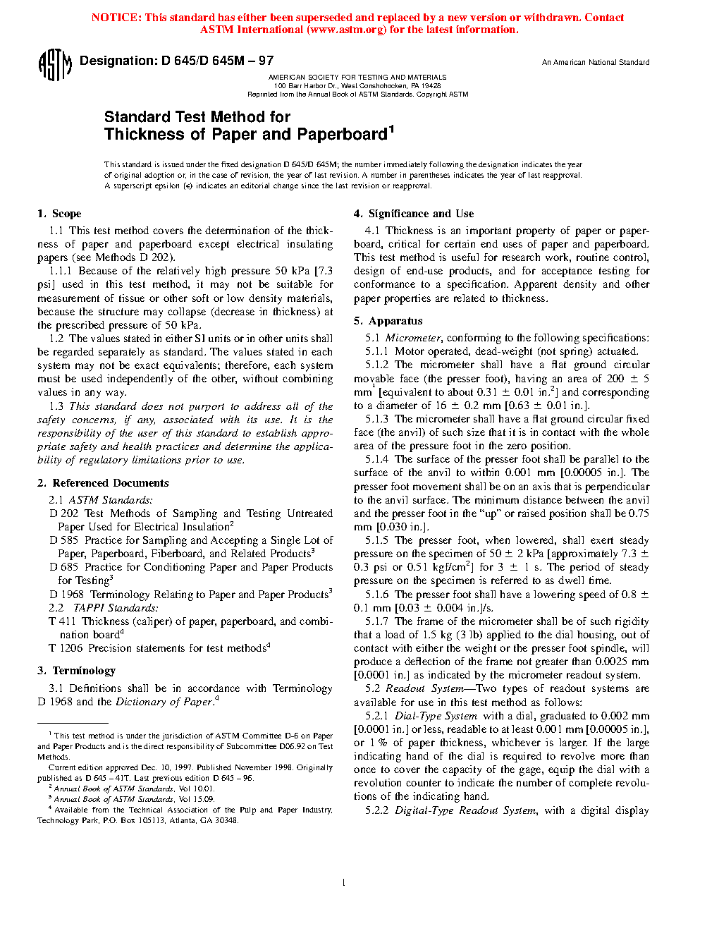 1.1 This test method covers the determination of the thickness of paper and paperboard except electrical insulating papers (see Methods D 202).