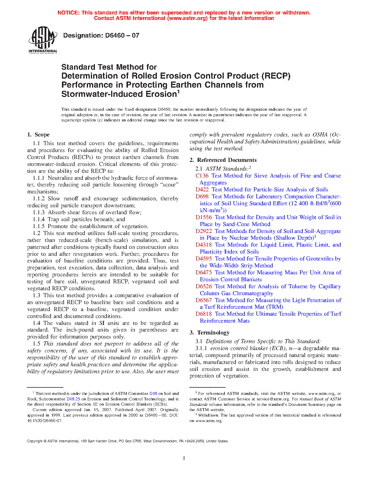 1.1 This test method covers the guidelines, requirements and procedures for evaluating the ability of Rolled Erosion Control Products (RECPs) to protect earthen channels from stormwater-induced erosion. Critical elements of this protection are the ability of the RECP to: